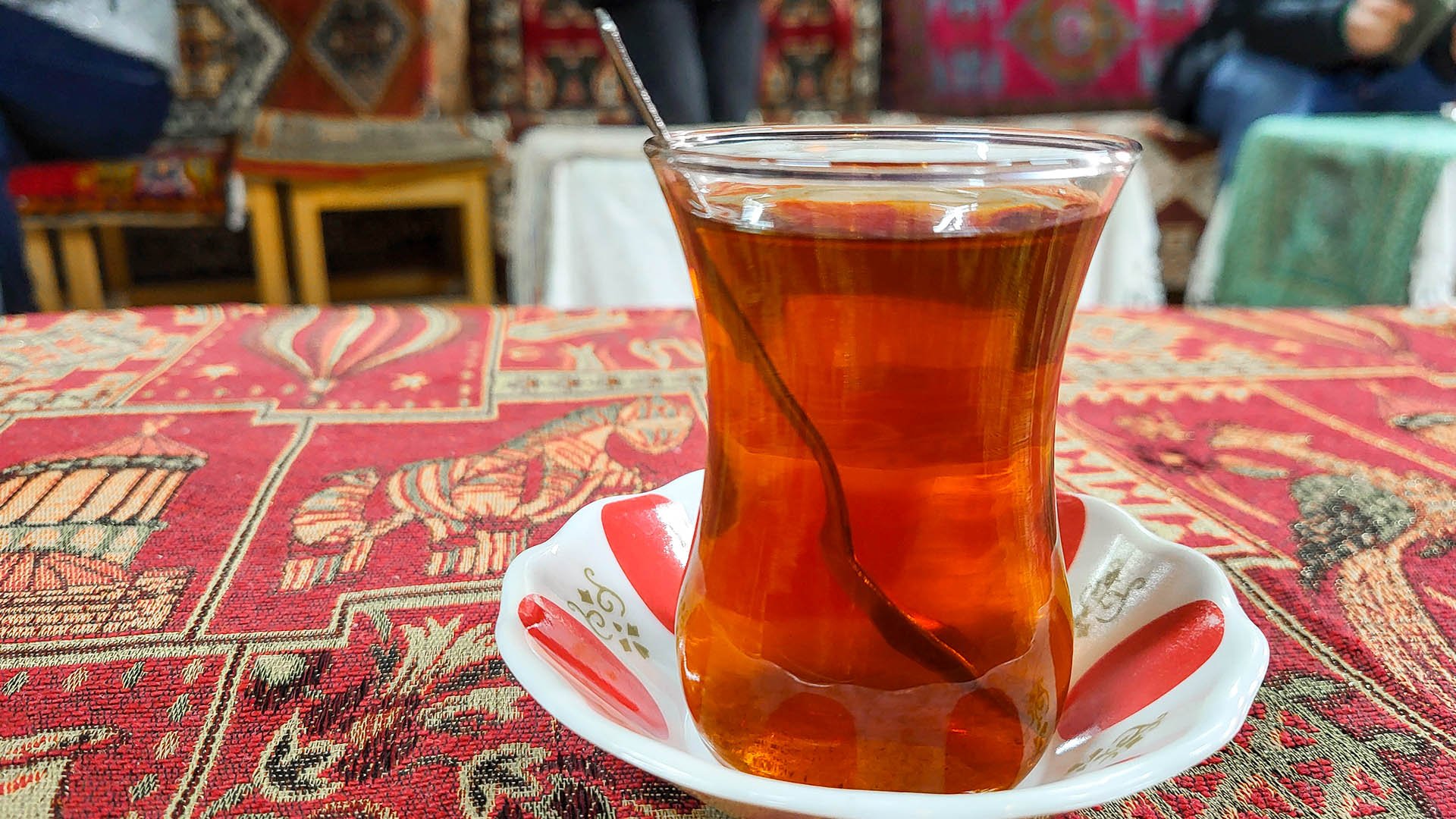 chłodniejszym pomieszczeniu ze szklaneczką ciepłej tureckiej herbaty.