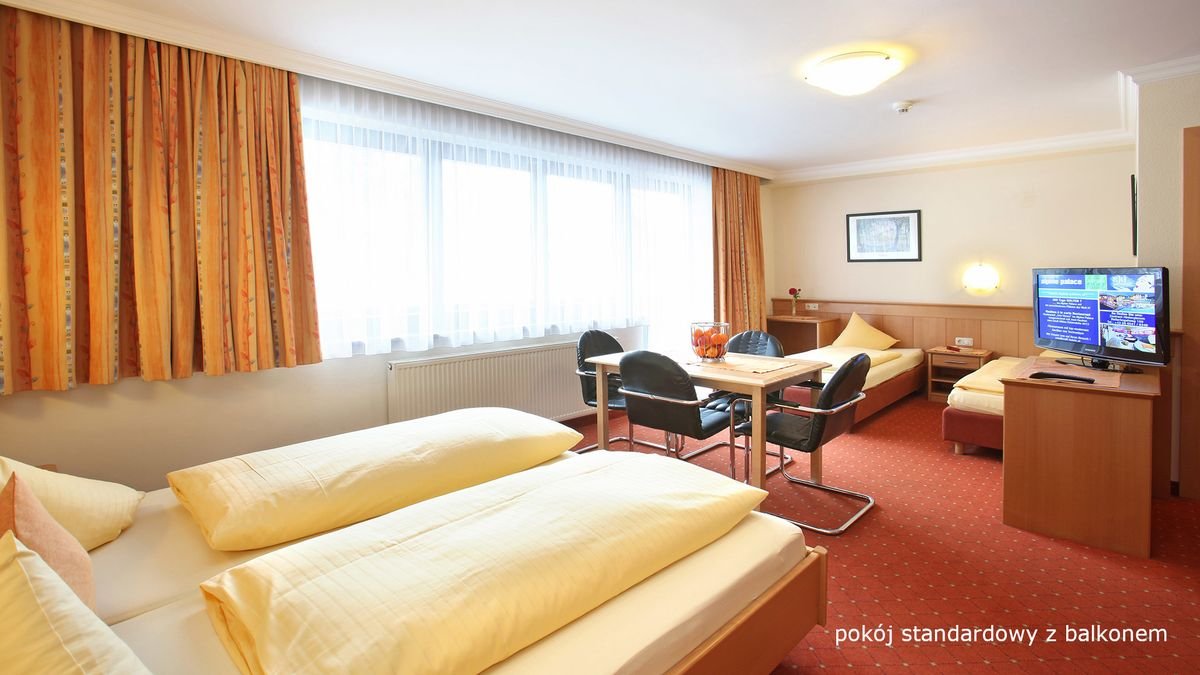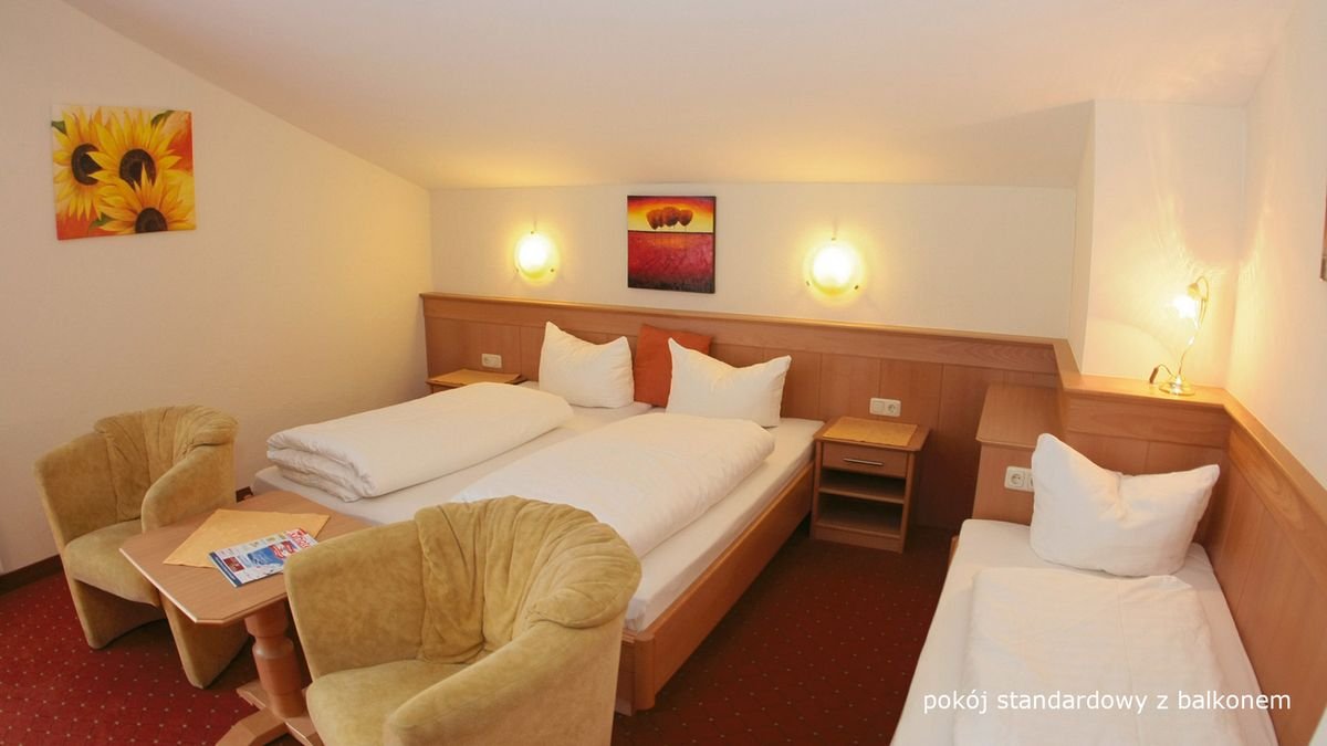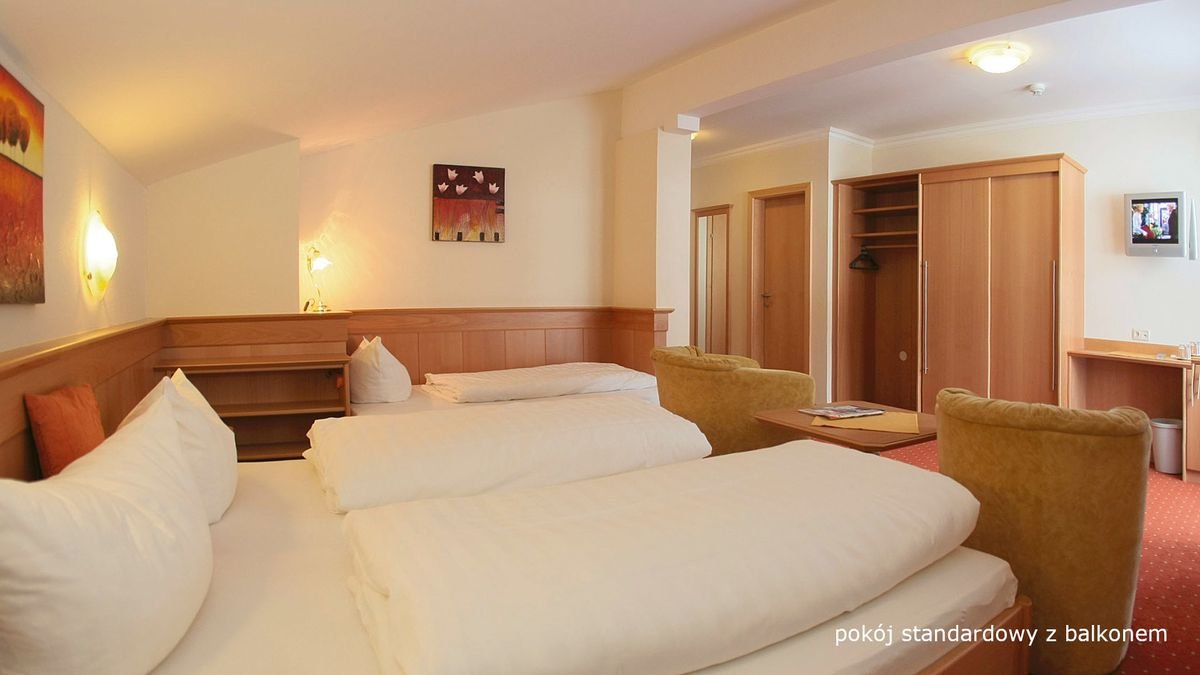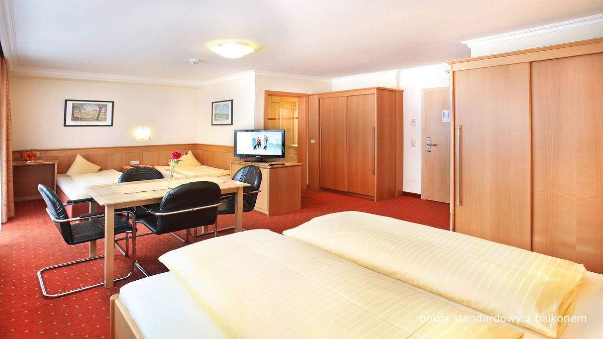 standardowy: 2-os., ok. 25 m², łazienka (wanna lub prysznic, wc; suszarka), internet bezprzewodowy, telewizja satelitarna, telefon; bezpłatne łóżeczko dla dziecka do 2 lat na zamówienie przed przyjazdem; ; standardowy z balkonem: 2-os. (możliwość 1 lub 2 dostawek), ok. 25-30 m², wyposażenie jak w pokoju standardowym; balkon, widok na góry; pokój standardowy z balkonem za dopłatą.