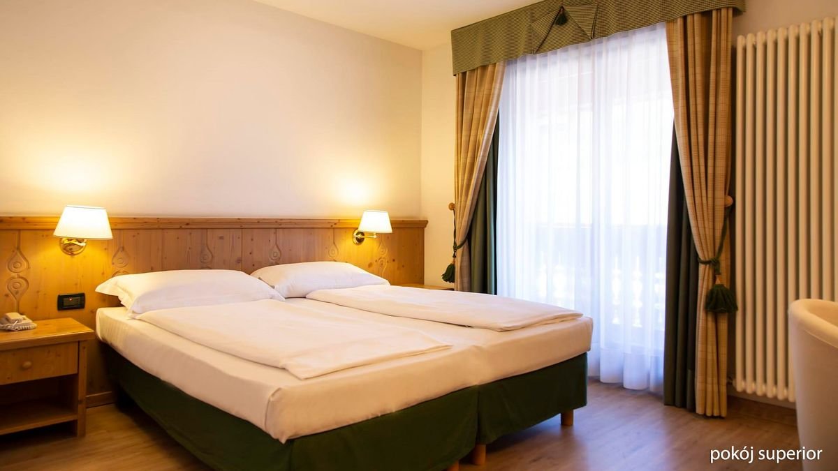 czterogwiazdkowy, zbudowany w 2003 r., 92 pokoje, budynek główny z pokojami standardowymi i superior, budynek depandance z pokojami rodzinnymi, 4 piętra, winda, hol, całodobowa recepcja, restauracja – dania w formie bufetu lub serwowane, bar; bezpłatny internet w lobby, przechowalnia sprzętu narciarskiego; za opłatą: parking (ok. 35 EUR/tydzień); akceptowane zwierzęta domowe do 10kg (za opłatą: ok. 20 EUR/dzień); akceptowane karty kredytowe: Visa, MasterCard.