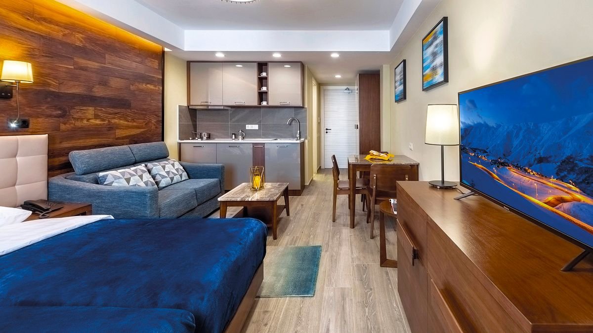 Nowoczesny aparthotel położony bezpośrednio przy stoku, to miejsce idealne na aktywny wypoczynek. Po całym dniu szaleństwa na śniegu można zrelaksować się w basenie lub w saunie. Komfortowo odpoczniesz w przestronnych i doskonale wyposażonych pokojach, typu studio z balkonami, o podniebienie zadba hotelowa restauracja, a sprzęt narciarski będzie bezpieczny w zamykanych i przypisanych do pokoju szafkach. Ten hotel będzie doskonałym wyborem dla tych, którzy na wakacjach lubią poczuć się jak w domu.