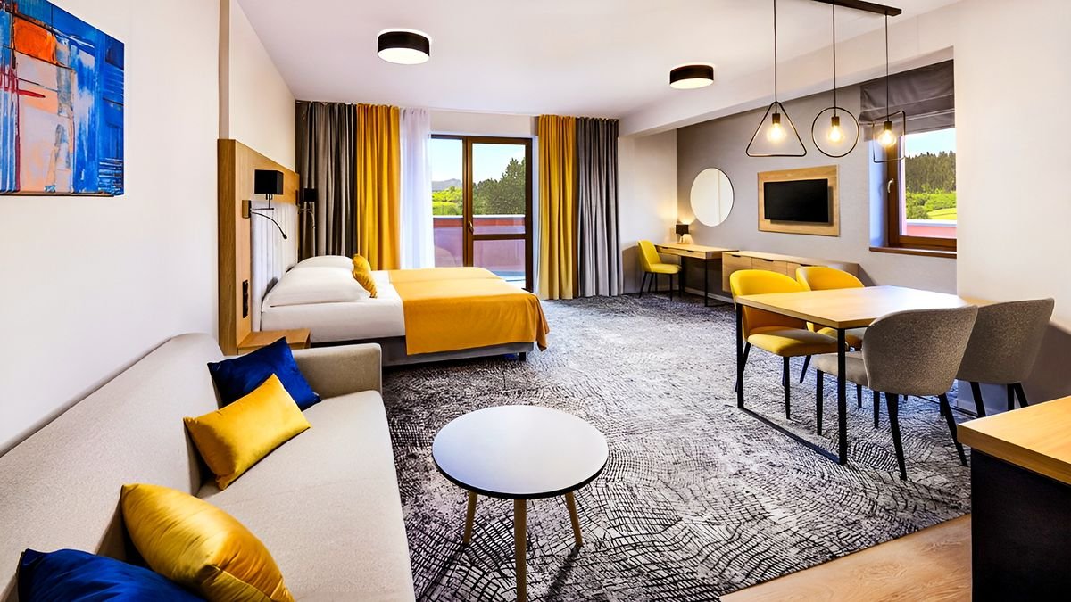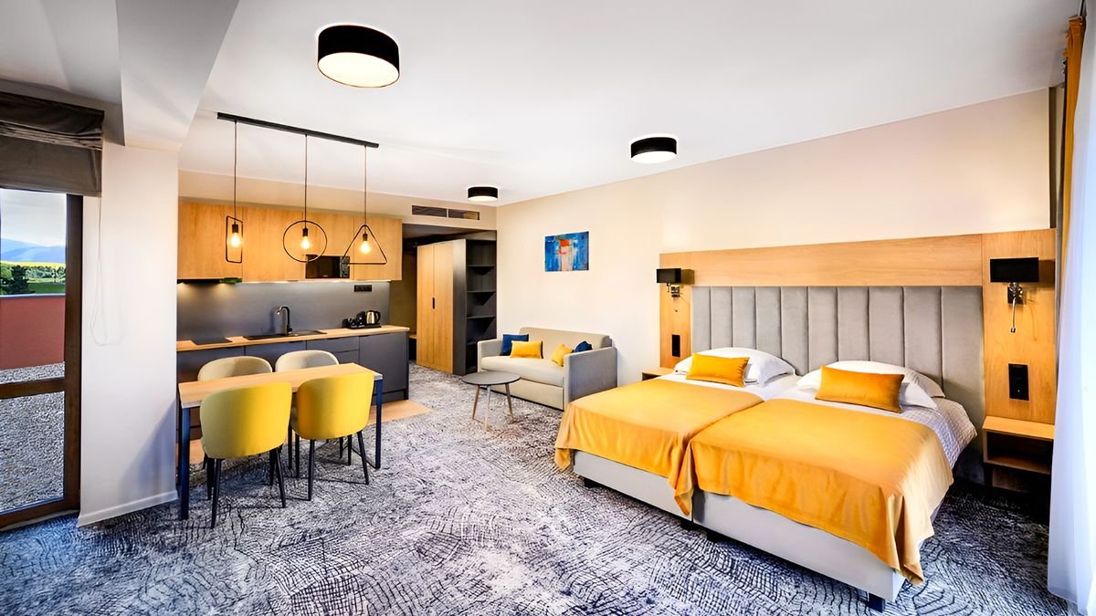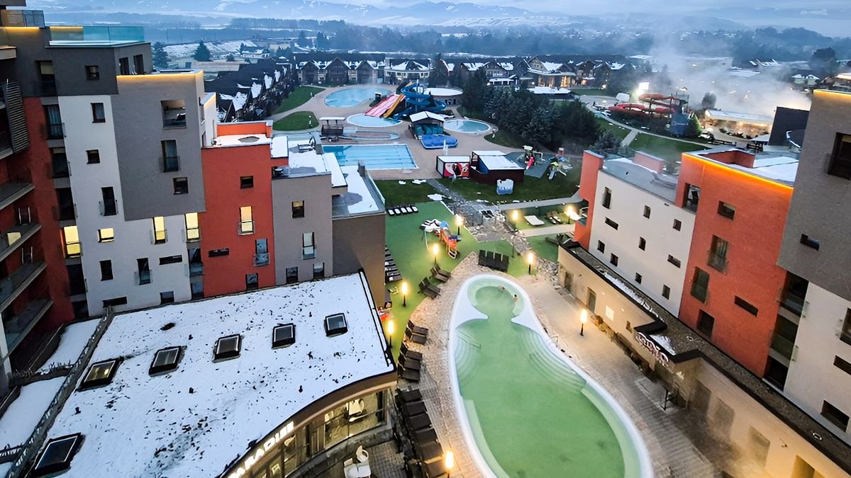 Zapraszamy na aktywne, rodzinne wakacje na terenie słynnego aquaparku Bešeňová! Nowoczesny hotel, zbudowany w 2021 r., oferuje nie tylko piękne widoki i świetny serwis, ale także basen termalny i mnóstwo innych atrakcji. Na miejscu czekają stylowo urządzone, eleganckie pokoje, które są przestronne i wyposażone w aneksy kuchenne. Goście mogą również korzystać z centrum wellness i zrelaksować się po aktywnym dniu – sauny, jacuzzi i szeroka gama zabiegów pielęgnacyjnych pozwolą zadbać o dobry nastrój podczas urlopu. Warto także wybrać się na wycieczkę po malowniczej, zielonej okolicy lub do słynnej Jaskini Lodowej!
