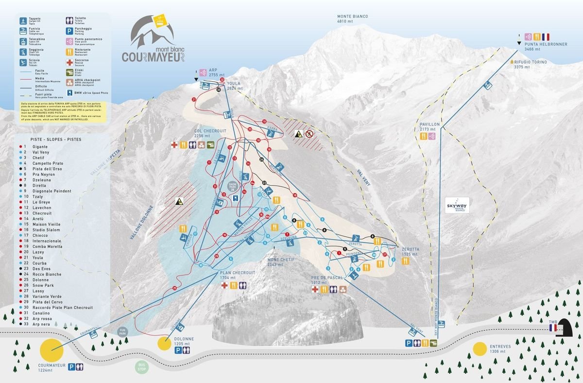 •ok. 3,5 km od kolei gondolowych Coumayeur i Val Dolonne na przełęcz Plan Checrouit (1704 m n.p.m.) – centralny punkt przesiadkowy, między innymi do gondoli na najwyższy szczyt Cresta d’Arp (2755 m n.p.m.) z dodatkowymi trasami poza wyznaczonymi zjazdami