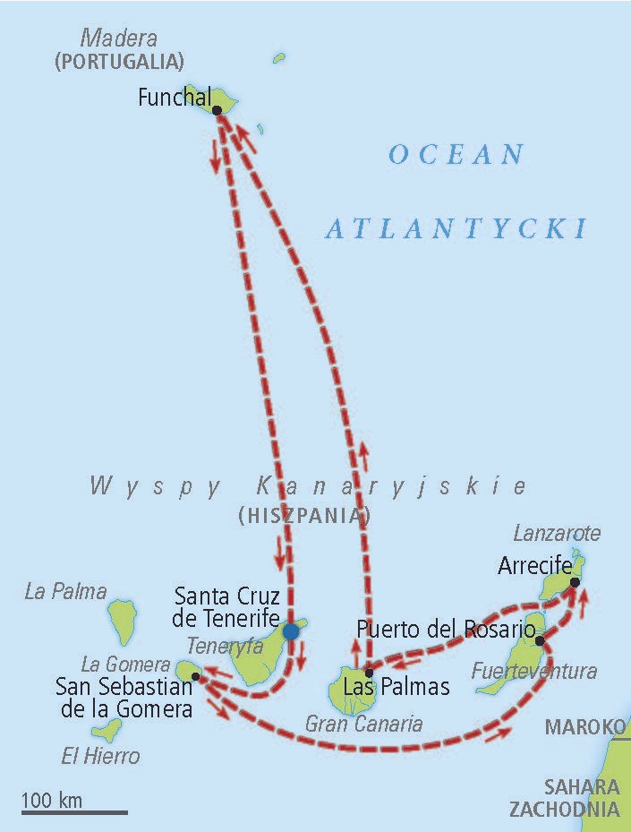 Ok. godz. 8.00 zawinięcie do portu w FUNCHAL, stolicy Madery, którą można zwiedzać pieszo lub słynną kolejką linową. Jest tu wiele ciekawych miejsc i kolorowy targ zadziwiający egzotycznymi owocami i kwiatami. Czas wolny i uczestnictwo w atrakcjach oferowanych na statku lub zejście na ląd. Fakultatywnie (za dodatkową opłatą) udział w wycieczkach. Wycieczka z opieką polskiego pilota „Funchal i słynne Cestinhos”. Ok. 4-godzinna wycieczka to okazja do poznania najpiękniejszych zakątków Madery, degustacji lokalnego wina oraz przejazdu tradycyjnymi wiklinowymi sankami – „cestinhos”. Program rozpoczyna się wizytą na Pico dos Barcelos, tarasie widokowym położonym 350 m n.p.m., skąd roztacza się malownicza panorama Funchal. Następnie planowany jest przejazd do Monte – miejscowości znanej z subtropikalnych ogrodów i kościoła, w którym znajduje się grób ostatniego cesarza Austrii, Karola I. Kolejnym punktem jest zjazd w dół słynnymi „cestinhos”, prowadzonymi przez mieszkańców w tradycyjnych strojach. Na zakończenie zaplanowana jest wizyta w XVII-wiecznym budynku w Funchal, gdzie odbywa się degustacja wina Madera oraz spacer po centrum miasta. - Usługę dodasz w procesie rezerwacji lub w Strefie Klienta (wycieczki zgodne z powyższą ofertą nie są dostępne do zakupu podczas rejsu). Ok. godz. 17.00 wypłynięcie z portu w kierunku Teneryfy. Nocleg.