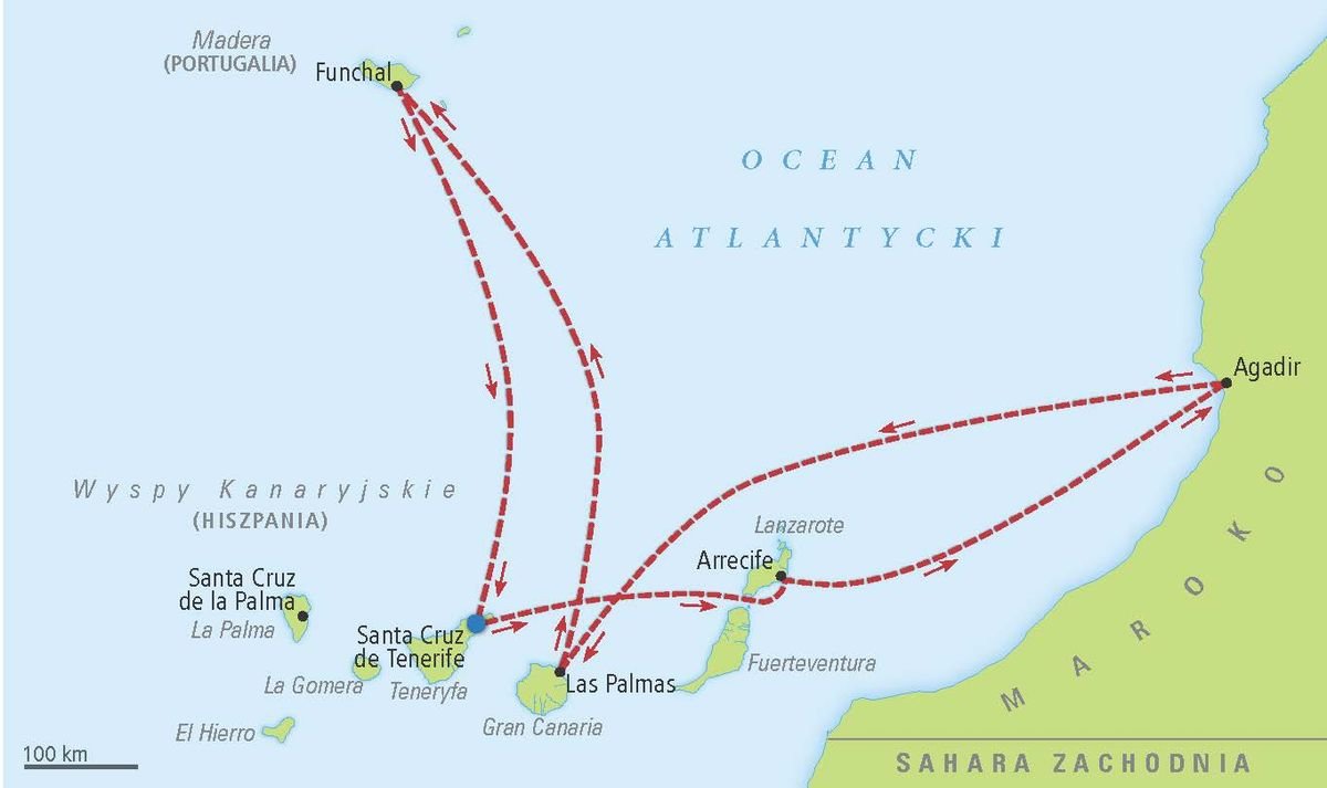 Ok. godz. 7.00 zawinięcie do portu w FUNCHAL, stolicy Madery, którą można zwiedzać pieszo lub słynną kolejką linową. Jest tu wiele ciekawych miejsc i kolorowy targ zadziwiający egzotycznymi owocami i kwiatami. Czas wolny i uczestnictwo w atrakcjach oferowanych na statku lub zejście na ląd. Fakultatywnie (za dodatkową opłatą) udział w wycieczkach. Wycieczka z opieką polskiego pilota „Funchal i słynne Cestinhos”. Ok. 4-godzinna wycieczka to okazja do poznania najpiękniejszych zakątków Madery, degustacji lokalnego wina oraz przejazdu tradycyjnymi wiklinowymi sankami – „cestinhos”. Program rozpoczyna się wizytą na Pico dos Barcelos, tarasie widokowym położonym 350 m n.p.m., skąd roztacza się malownicza panorama Funchal. Następnie planowany jest przejazd do Monte – miejscowości znanej z subtropikalnych ogrodów i kościoła, w którym znajduje się grób ostatniego cesarza Austrii, Karola I. Kolejnym punktem jest zjazd w dół słynnymi „cestinhos”, prowadzonymi przez mieszkańców w tradycyjnych strojach. Na zakończenie zaplanowana jest wizyta w XVII-wiecznym budynku w Funchal, gdzie odbywa się degustacja wina Madera oraz spacer po centrum miasta. Usługę dodasz w procesie rezerwacji lub w Strefie Klienta (wycieczki zgodne z powyższą ofertą nie są dostępne do zakupu podczas rejsu). Ok. godz. 17.00 wypłynięcie z portu w kierunku Teneryfy. Nocleg.