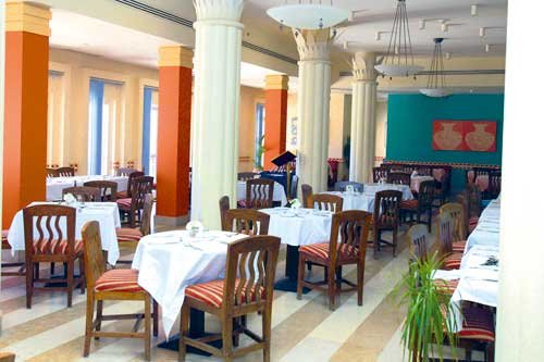 śniadanie (6.30-10.30), obiad (12.30-15.30), kolacja (18.00-22.30) w restauracji głównej, śniadanie i kolacja w formie bufetu; zamiennie obiad w barze przy basenie w formie bufetu lub à la carte; lokalne napoje bezalkoholowe i alkoholowe w wyznaczonym barze (11.00 – 23.00); wymagane noszenie opasek all inclusive.