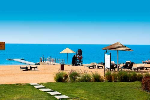 hotelowa, piaszczysta, długa, łagodne zejście do morza, pomost, bezpośrednio przy hotelu (odległość zależy od lokalizacji pokoju: 50-100 m), dojście przez teren hotelu, bezpłatne parasole, leżaki, materace i ręczniki.