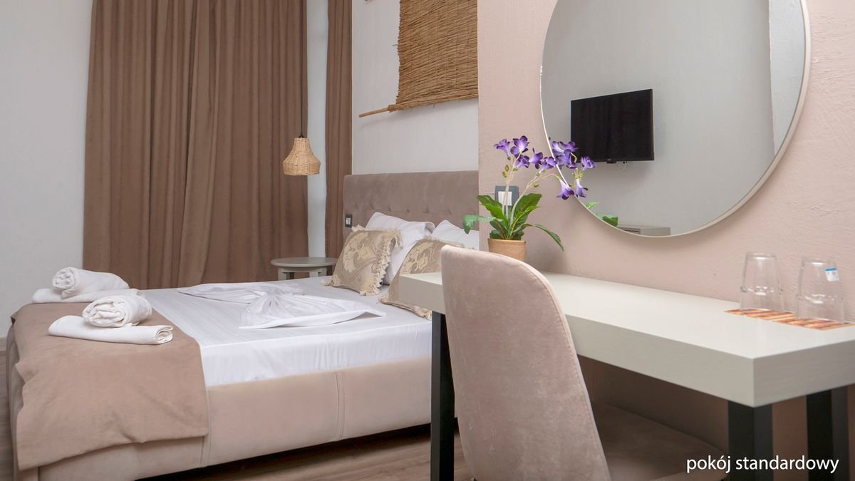 standardowy: 2-os., ok. 19 m², nowoczesny, indywidualnie sterowana klimatyzacja, łazienka (prysznic, wc; suszarka), internet bezprzewodowy, telewizja satelitarna, lodówka, sejf; balkon (stolik i krzesełka), widok na ogród lub ulicę; superior: 2-os., ok. 20 m², elegancki i nowoczesny, wyposażenie jak w pokoju standardowym; pokój superior za dopłatą.