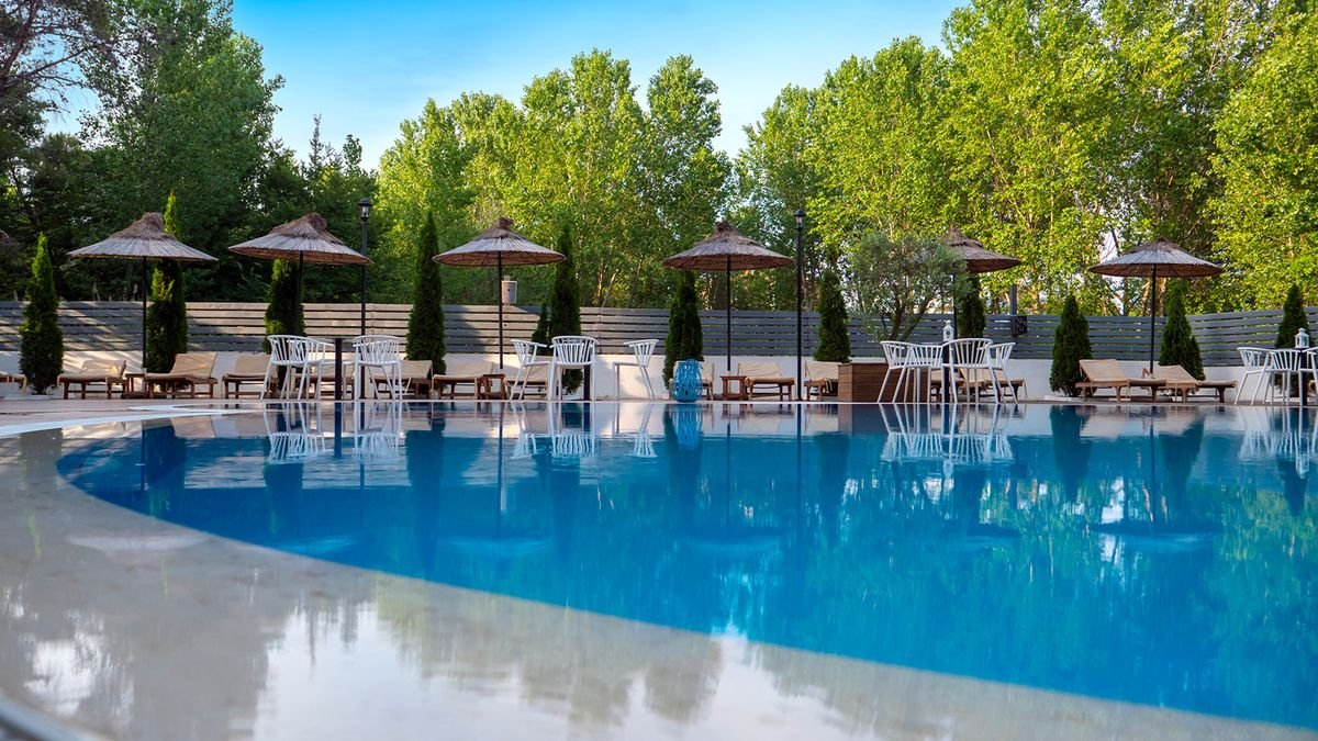 basen, słodka woda, nieregularny kształt, ok. 100 m², gł. 0,6-1,7 m, przy basenie bezpłatne parasole i leżaki.