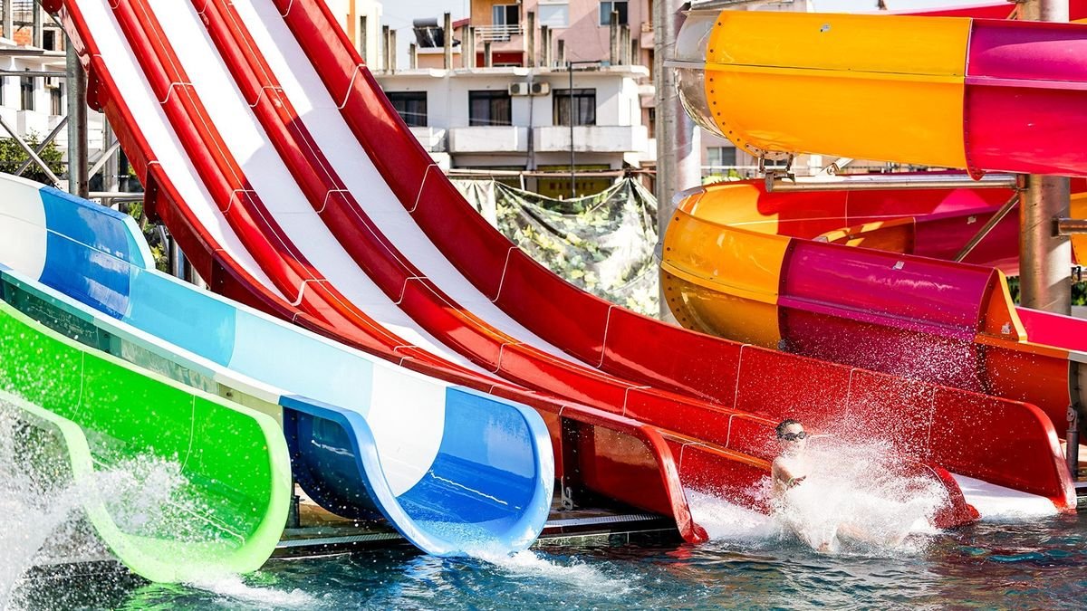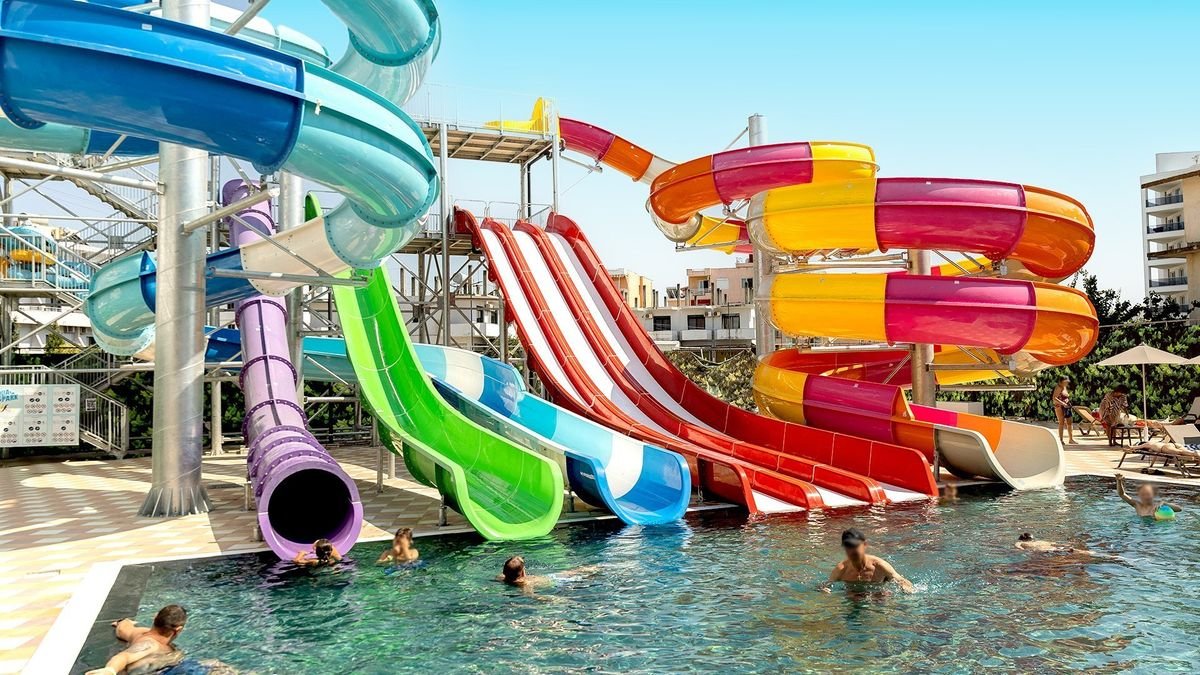 •2 baseny, słodka woda: główny, ok. 600 m², gł. 1,4 m, Aqua Park, ok. 200 m², gł. 1,2 m, 4 zjeżdżalnie