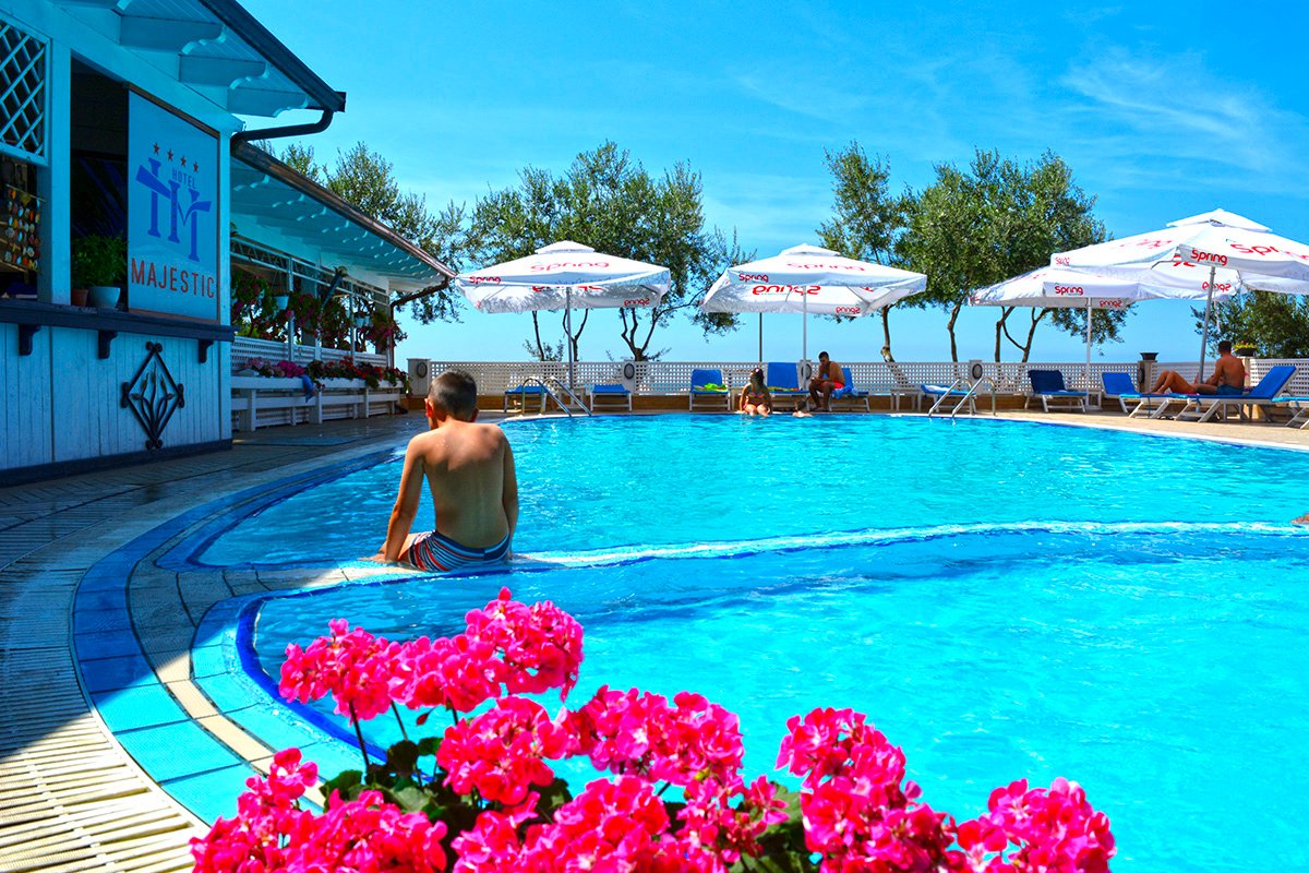 basen, nieregularny kształt, ok. 100 m², słodka woda, gł. 0,6-2 m, wydzielona część dla dzieci, gł. 0,6 m, przy basenie bezpłatne parasole i leżaki.