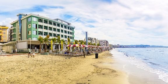 ok. 2 km od centrum DURRES, najbliższe sklepy i bary ok 50 m od hotelu, przy drodze lokalnej; ok. 33 km od lotniska w Tiranie; przystanek autobusowy ok. 150 m od hotelu (Durres/ok. 0,5 EUR).