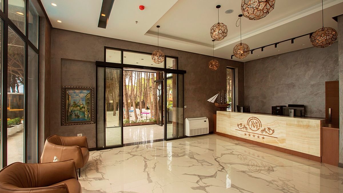 w dzielnicy turystycznej Mali Robit, ok. 5 km od GOLEM, ok. 100 m od sklepów i barów, ok. 17 km od Durrës; ok. 35 km od lotniska w Tiranie; przystanek autobusowy bezpośrednio przy hotelu (ok. 1 EUR/centrum Durrës).