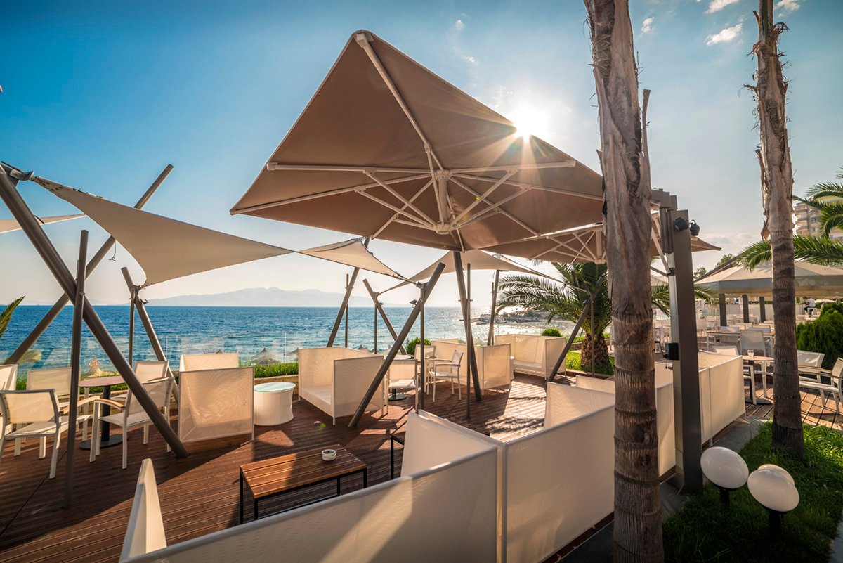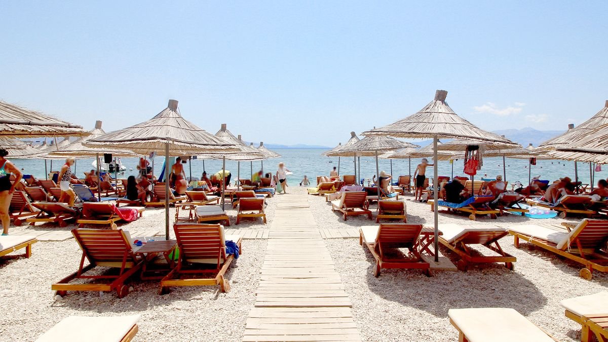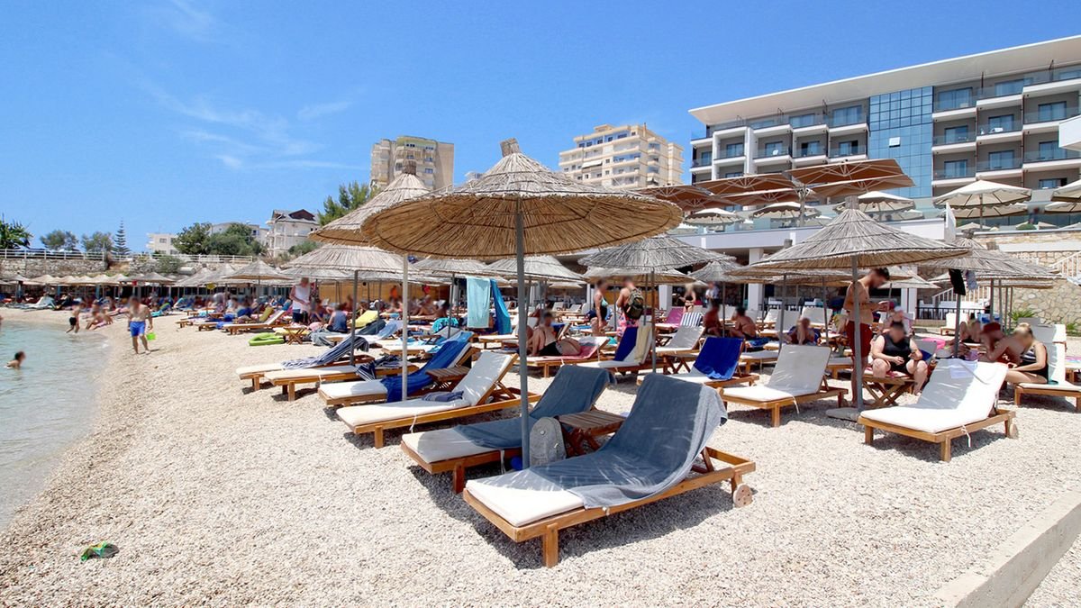 hotelowa, żwirowo-kamienista, łagodne zejście do morza, blisko brzegu głęboka woda, zalecane obuwie ochronne, bezpośrednio przy hotelu, ok. 50 m od recepcji hotelowej, zejście po schodkach, płatne parasole i leżaki (ok. 3,5 EUR/komplet/dzień), ręczniki (ok. 1 EUR/dzień, depozyt: ok. 20 EUR).