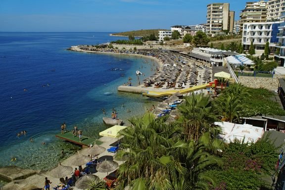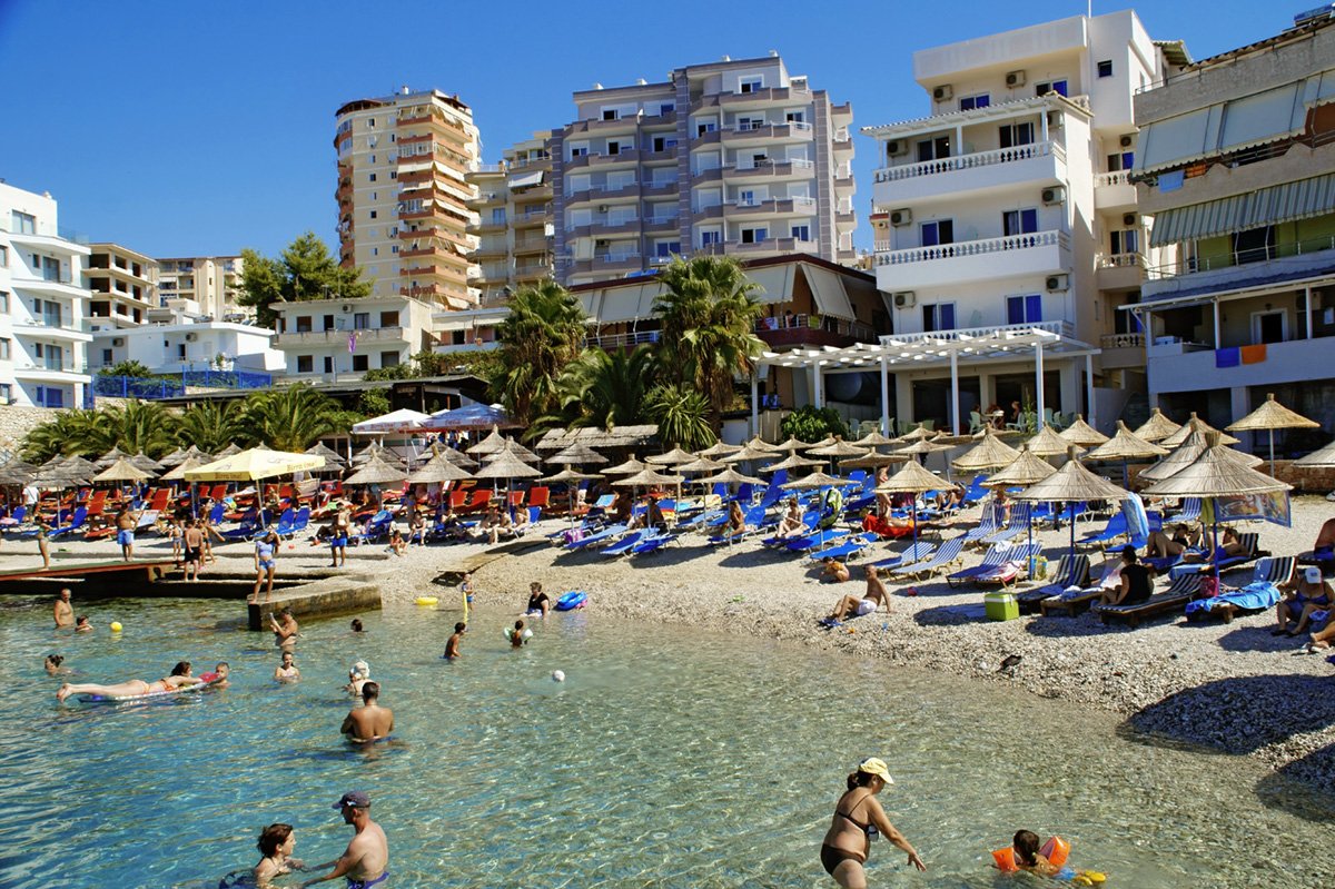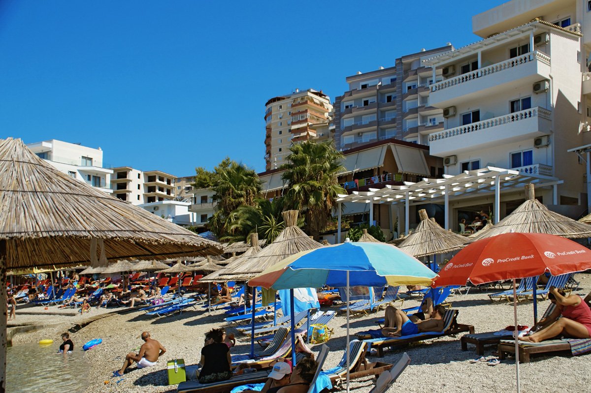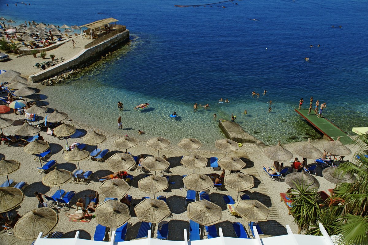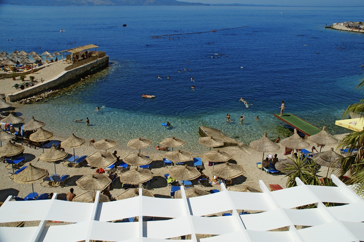 Vila E Bardhe, hotelowa, żwirowo-kamienista, zalecane obuwie ochronne, łagodne zejście do morza, blisko brzegu głęboka woda, bezpośrednio przy hotelu, zejście po schodach, bezpłatne parasole i leżaki, ręczniki płatne.