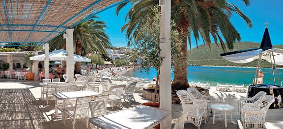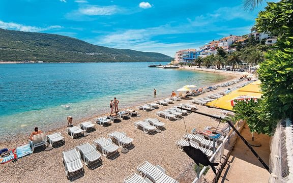 publiczna, żwirowa, łagodne zejście do morza, dno kamieniste, zalecane obuwie ochronne, ok. 200 m od hotelu, przejście przez ulicę, parasole i leżaki płatne (ok. 5 BAM/parasol, ok. 5 BAM/leżak).
