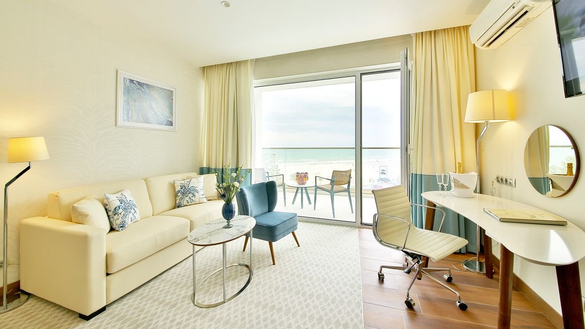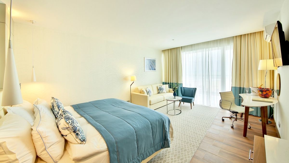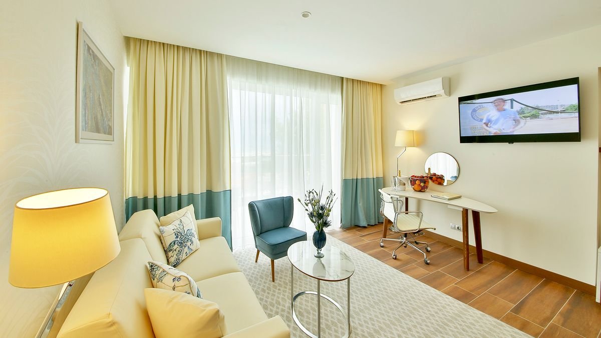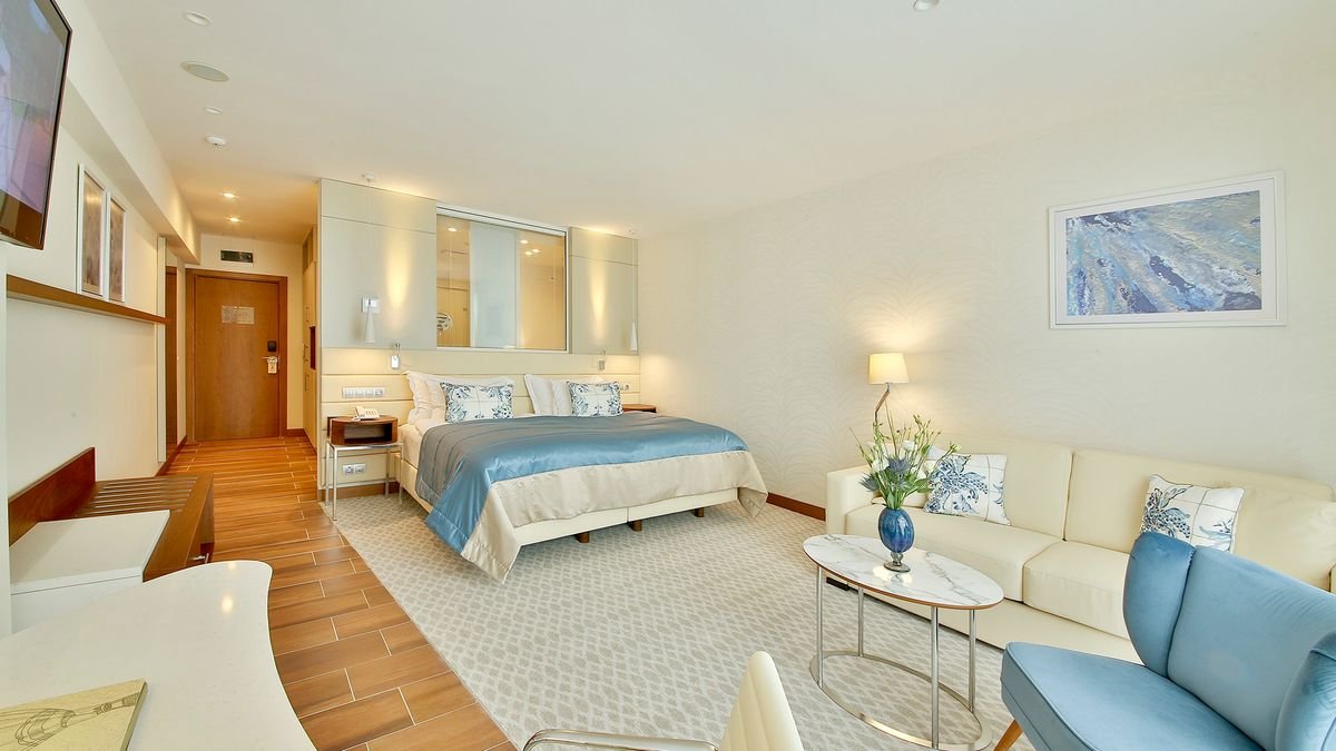 deluxe: 2-os. (możliwość 1 dostawki dla os. dorosłej lub 2 dzieci – łóżko małżeńskie lub sofa), ok. 20-23 m², elegancki i nowoczesny, klimatyzowany, łazienka (wanna lub prysznic, wc; suszarka), internet bezprzewodowy, telewizja, telefon, minibar (płatny wg konsumpcji), zestaw do kawy/herbaty, sejf, bezpłatne łóżeczko dla dziecka do 2 lat; balkon lub taras (stolik i krzesełka), widok na morze.