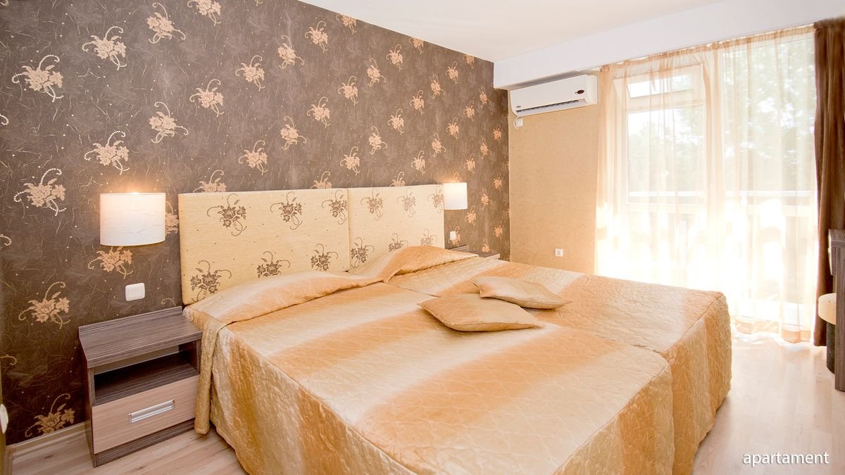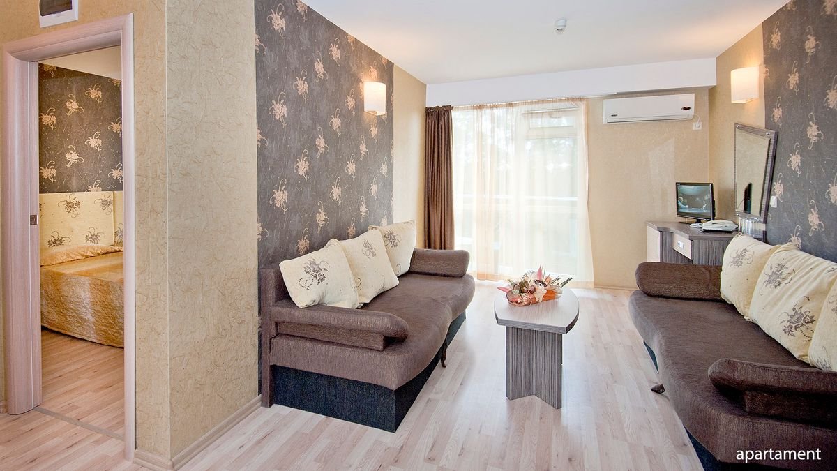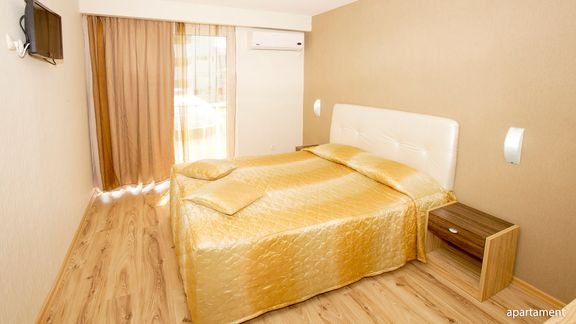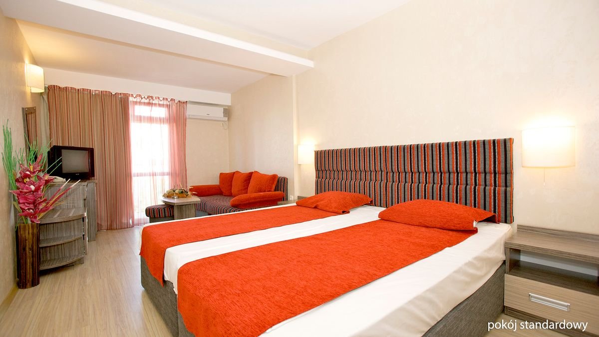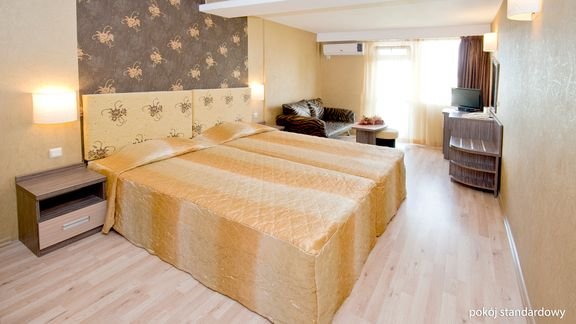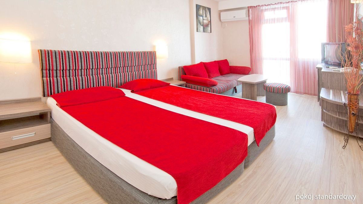 standardowy: 2-os. (możliwość 1 dostawki), ok. 24 m², zadbany, klimatyzowany, łazienka (prysznic, wc; suszarka), telewizja satelitarna, telefon; za opłatą: internet bezprzewodowy (ok. 1 BGN/godz.), minibar (płatny wg konsumpcji); łóżeczko dla dziecka do 2 lat na zamówienie przed przyjazdem (ok. 5 BGN/dzień); balkon (stolik i krzesła); apartament: 2-os. (możliwość 2 dostawek; 3-os. pełnopłatne), ok. 36 m², zadbany, sypialnia i pokój dzienny oddzielone drzwiami, wyposażenie jak w pokoju standardowym; apartament za dopłatą.