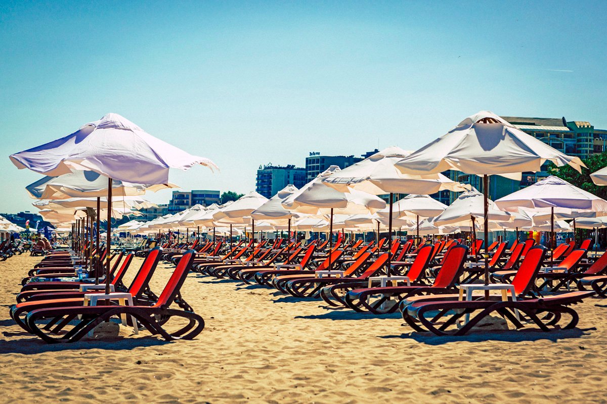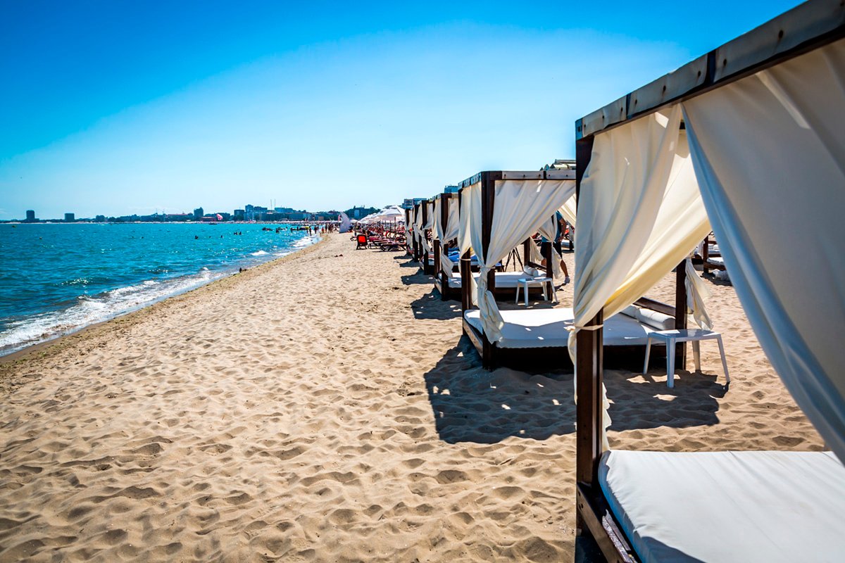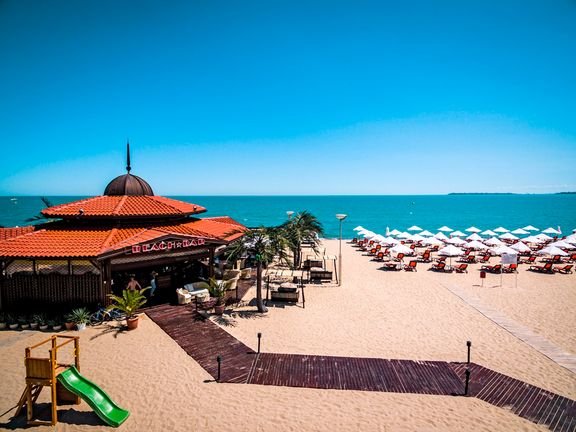 publiczna, wydzielona część hotelowa, piaszczysta, szeroka, łagodne zejście do morza, wyróżniona certyfikatem Błękitna Flaga, ok. 70 m od hotelu, dojście do plaży przez teren hotelu i nadmorską promenadę, bezpłatne parasole i leżaki.