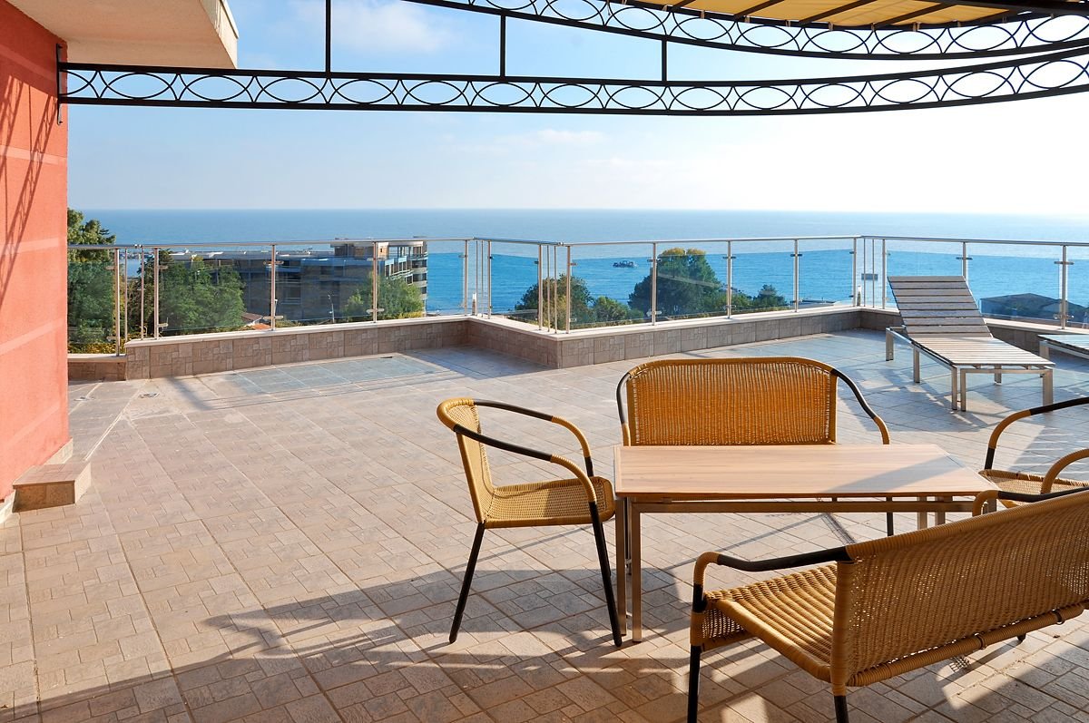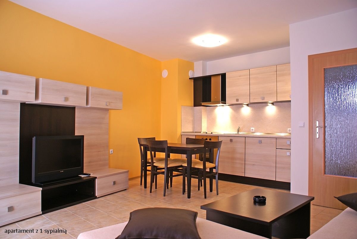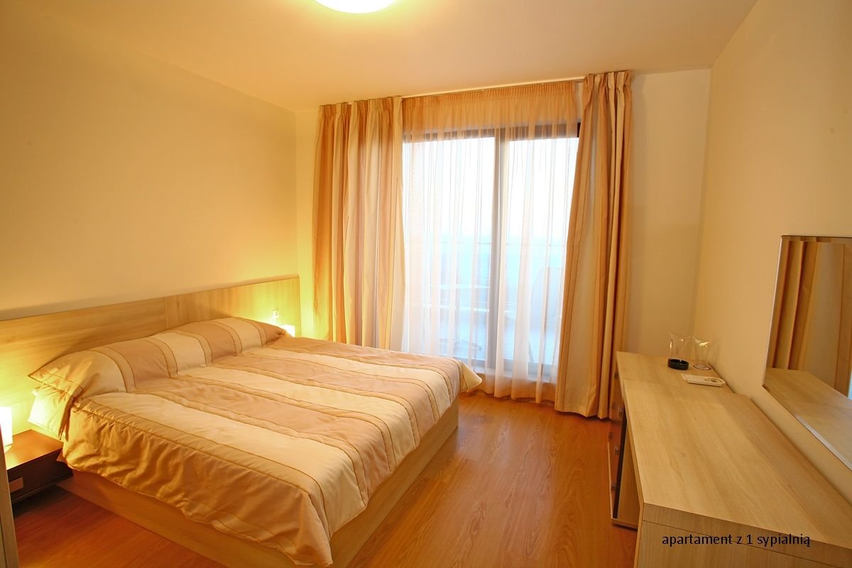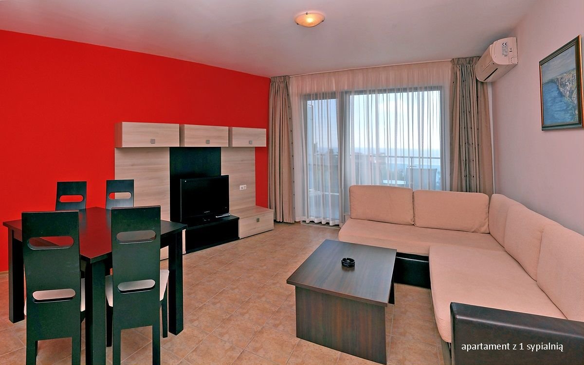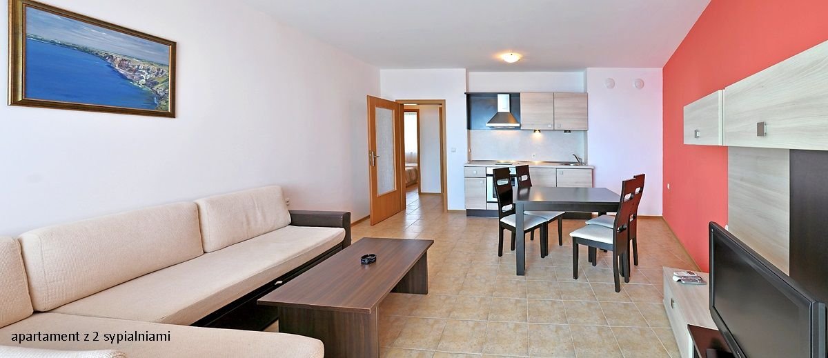 apartament z 1 sypialnią: 2-os. (możliwość 1 lub 2 dostawek), ok. 70 m², indywidualnie sterowana klimatyzacja, łazienka (prysznic, wc), pokój dzienny (klimatyzowany) i sypialnia oddzielone drzwiami, aneks kuchenny (kuchenka, naczynia i sztućce), internet bezprzewodowy, telewizja satelitarna, telefon, lodówka; za opłatą: internet przewodowy (10 BGN/dzień); bezpłatne łóżeczko dla dziecka do 2 lat na zamówienie przed przyjazdem; balkon (stolik i krzesełka), widok na morze; apartament z 2 sypialniami: 3‑os. (min. 3 os. pełnopłatne; możliwość 1 lub 2 dostawek), ok. 95 m², pokój dzienny (klimatyzowany) i 2 sypialnie oddzielone drzwiami, wyposażenie jak w apartamencie z 1 sypialnią, widok na morze.