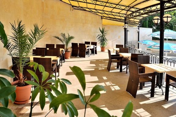 trzygwiazdkowy, zbudowany w 2007 r., 47 pokoi, 1 budynek, 6 pięter, 3 windy, hol, całodobowa recepcja, restauracja z tarasem – dania w formie bufetu, kuchnia bułgarska i międzynarodowa, dostępne foteliki dla dzieci, dania wegetariańskie, bar w restauracji; parking; taras z widokiem na basen, bezpłatny internet bezprzewodowy na terenie hotelu; za opłatą: sejf w recepcji, pralnia, wypożyczalnia samochodów; akceptowane karty kredytowe: Visa, MasterCard, American Express.