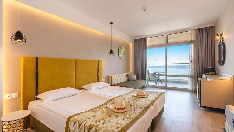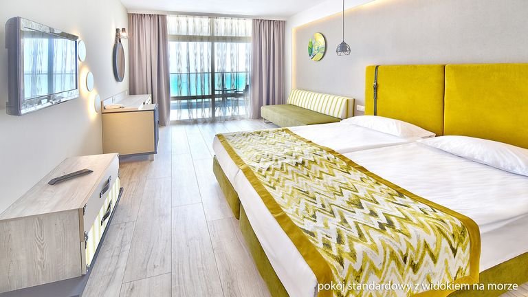 Położony nad morzem, tuż przy pięknej, piaszczystej plaży oddzielonej od hotelu jedynie promenadą, należy do znanej i lubianej sieci Grifid Hotels Group. To idealne miejsce na beztroskie wczasy z rodziną. Dla dzieciaków jest tu świetnie zorganizowany miniklub, w ciągu dnia i wieczorami odbywają się ciekawe animacje dla całej rodziny. Do dyspozycji Gości są słoneczne, przytulne pokoje z balkonem, 3 restauracje i 4 bary. Blisko stąd do centrum Złotych Piasków, do którego można dojść promenadą lub dojechać minikolejką.