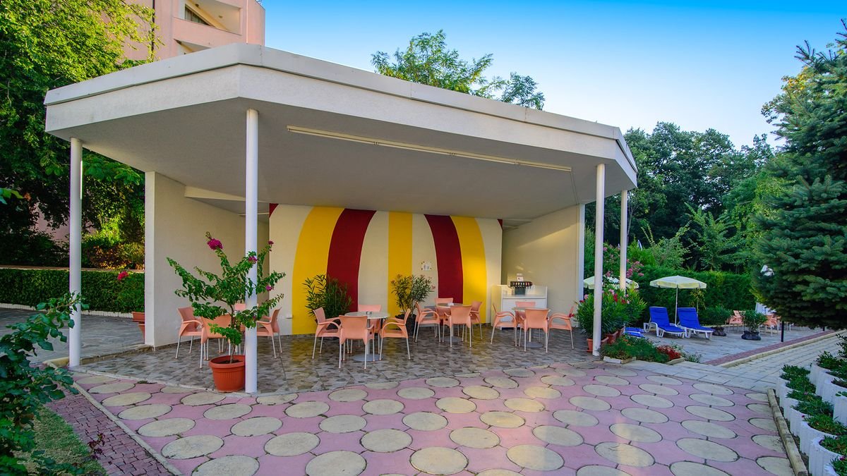 w spokojnej okolicy, ok. 500 m od centrum ZŁOTYCH PIASKÓW z licznymi sklepami, restauracjami i barami; ok. 30 km od lotniska w Warnie, ok. 130 km od lotniska w Burgas; przystanek autobusowy ok. 30 m od hotelu.