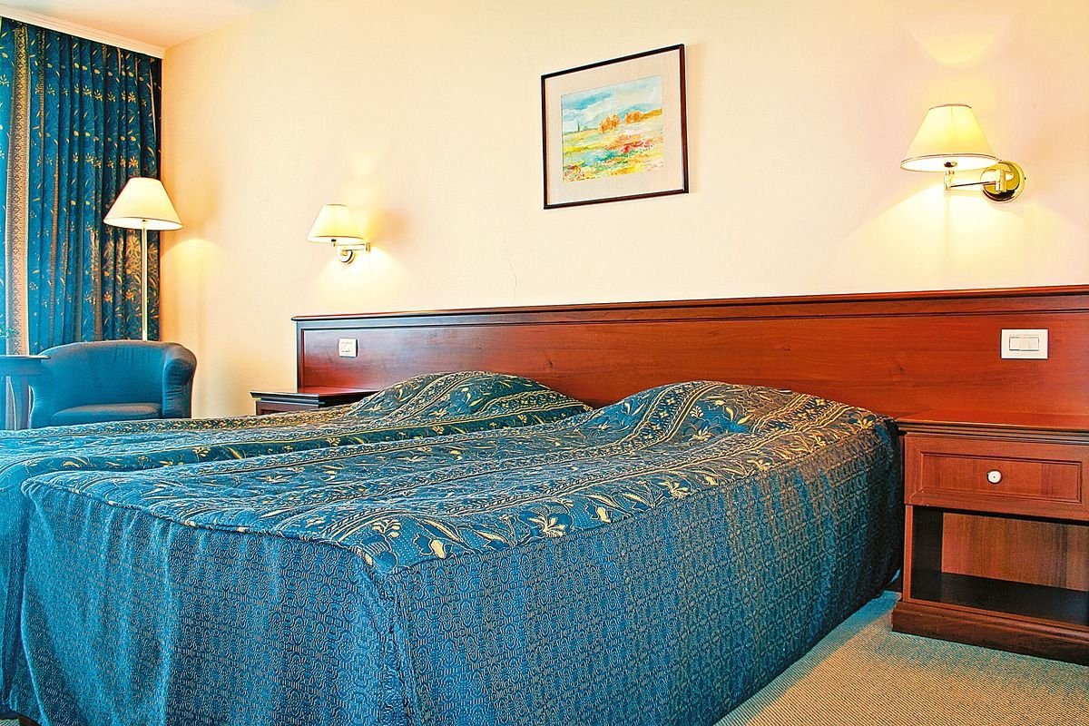 w południowej części ZŁOTYCH PIASKÓW, sklepy i restauracje na terenie kompleksu; ok. 1,5 km od centrum kurortu, przy ładnym, bujnym, zielonym parku; ok. 30 km od portu lotniczego w Warnie; przystanek autobusowy ok. 500 m od hotelu (3 BGN/Warna).