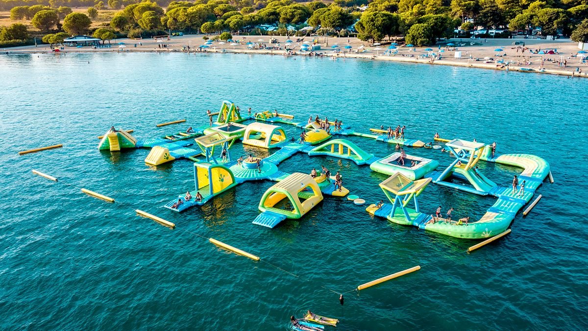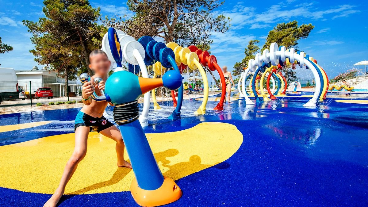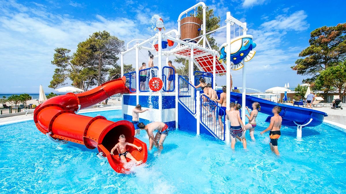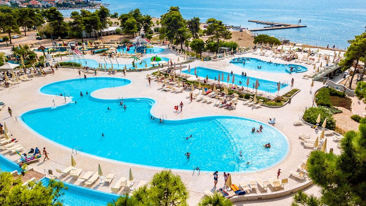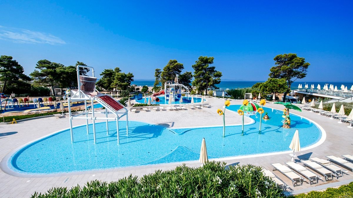 •9 basenów, słodka woda: ok. 825 m², ok. 174 m², dla dzieci: ok. 340 m², gł. 0,3 m, z hydromasażem i panoramicznym widokiem na Adriatyk: 182 m², 3 mniejsze z hydromasażem: od 86 do 115 m² i gł. 0,9 m, 2 ze zjeżdżalniami dla dzieci: ok. 220 m², gł. 0,3 m i ok. 60 m², gł. 0,3 m•kompleks basenowy o powierzchni ok. 2500 m², w tym basen dla dzieci o powierzchni ok. 300 m² z 2 zjeżdżalniami – lokalizacja przy kortach tenisowych, planowane otwarcie w połowie czerwca 2025 r.