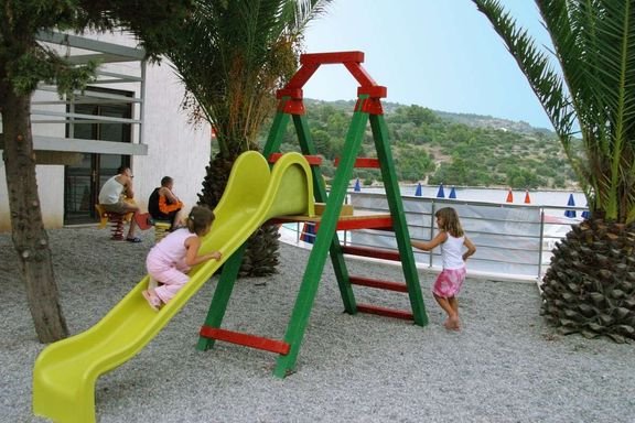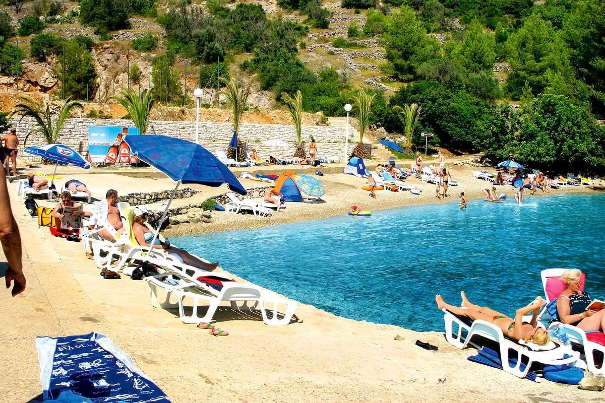 hotelowa, w zatoce, żwirkowo-kamienista, zejście do morza schodkami z platformy, zalecane obuwie ochronne, ok. 20 m od hotelu, parasole i leżaki płatne (ok. 3 EUR/dzień).