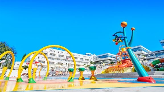 basen, słona woda, przy basenie bezpłatne leżaki; Spray Park: ok. 1000 m² – zjeżdżalnie wodne, wodny plac zabaw i basen dla dzieci; za opłatą: kort tenisowy, minigolf, tenis stołowy, bule, bezpłatnie: siatkówka plażowa; miniklub (4-12 lat), minidisco, dzienne i wieczorne animacje, okazjonalnie muzyka na żywo; studio masażu (płatne); w okolicy sporty wodne na plaży (oferta zewnętrzna).