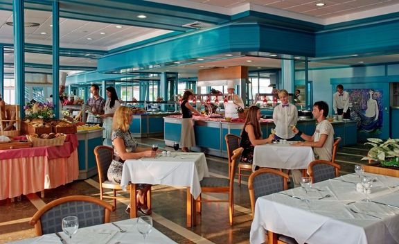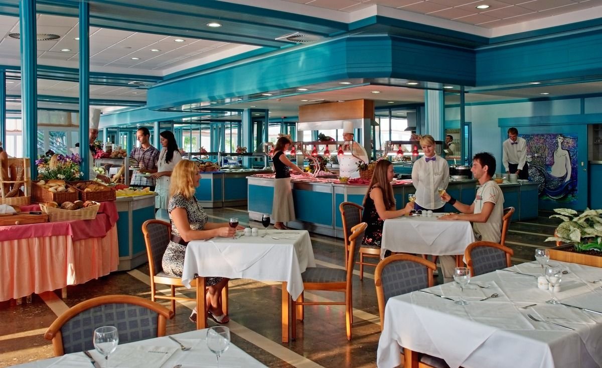 trzygwiazdkowy, należący do sieci Remisens, a wcześniej Iberostar; zadbany, sezonowo odnawiany, 312 pokoi, 5 budynków połączonych ze sobą, 3 piętra, przestronne lobby, całodobowa recepcja z sejfem (kaucja ok. 10 EUR/tydz.), restauracja – dania w formie bufetu, obsługa kelnerska, kuchnia międzynarodowa, okazjonalnie bufety tematyczne, dostępne foteliki dla dzieci, dania wegetariańskie, inne diety na zamówienie przed przyjazdem, pizzeria w pobliżu basenu; 2 bary: w lobby i przy plaży, taras z widokiem na morze; za opłatą: punkt internetowy i internet bezprzewodowy w lobby – ograniczony zasięg (ok. 10 EUR/godz.), opiekunka do dziecka (na zamówienie przed przyjazdem); akceptowane karty kredytowe: Visa, MasterCard, American Express, Diners Club