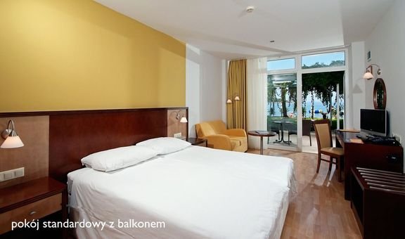 standardowy: 2-os. (możliwość 1 dostawki dla dziecka), ok. 18 m², prosto i funkcjonalnie urządzony, klimatyzowany (01.06-15.09), łazienka (wanna lub prysznic, wc; suszarka), telewizja satelitarna, telefon, Wi-Fi; bezpłatne łóżeczko dla dziecka do 2 lat na zamówienie przed przyjazdem; pokój z bocznym widokiem na morze na zamówienie, za dopłatą.