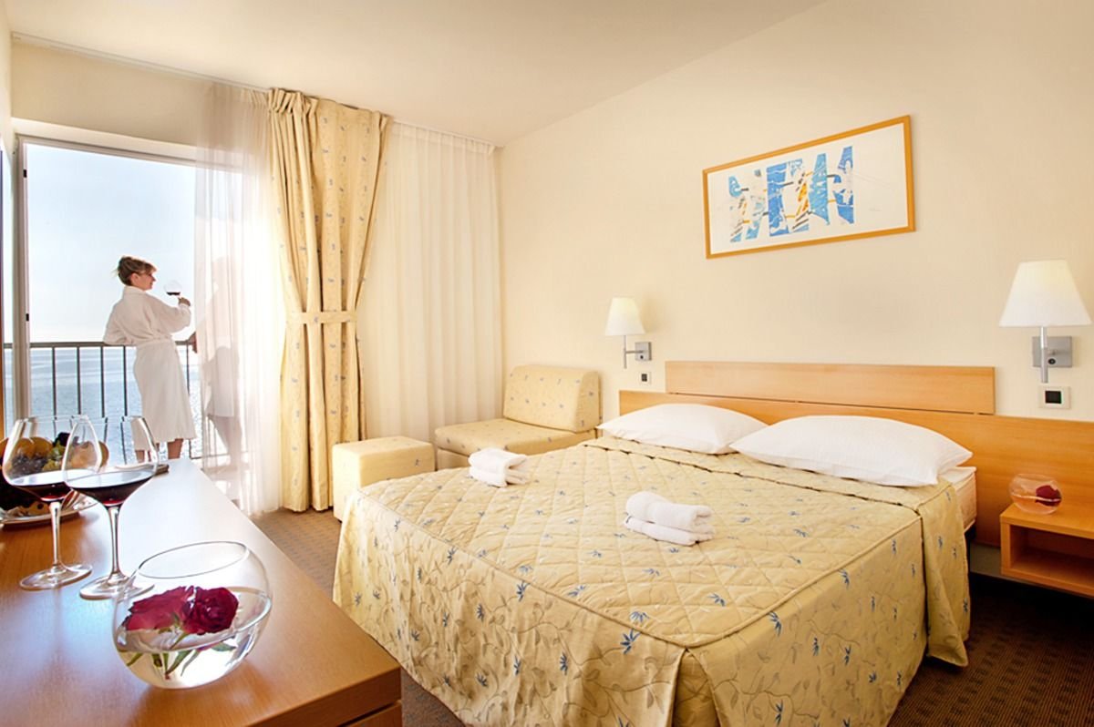 standardowy: 2-os. (możliwość 1 dostawki), ok. 20 m², w budynku głównym, zadbany, klimatyzowany (w terminie: 15.06-15.09), łazienka (wanna lub prysznic, wc; suszarka), podłączenie do internetu (w części pokoi internet bezprzewodowy, w pozostałych możliwość wypożyczenia kabla – ograniczona ilość oraz ograniczony zasięg), telewizja satelitarna, telefon, sejf, minibar (płatny); bezpłatne łóżeczko dla dziecka do 2 lat na zamówienie przed przyjazdem; balkon (stolik i krzesełka); pokoje z widokiem na morze.