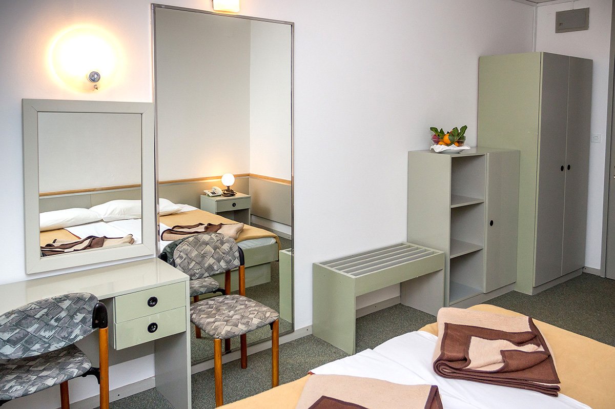 standardowy: 2-os. (możliwość 1 lub 2 dostawek), ok. 16 m², zadbany, łazienka (prysznic, wc), internet bezprzewodowy (kod do pobrania w recepcji), telewizja satelitarna, polskie programy, telefon, lodówka (płatna); bezpłatne łóżeczko dla dziecka do 2 lat na zamówienie przed przyjazdem; balkon.