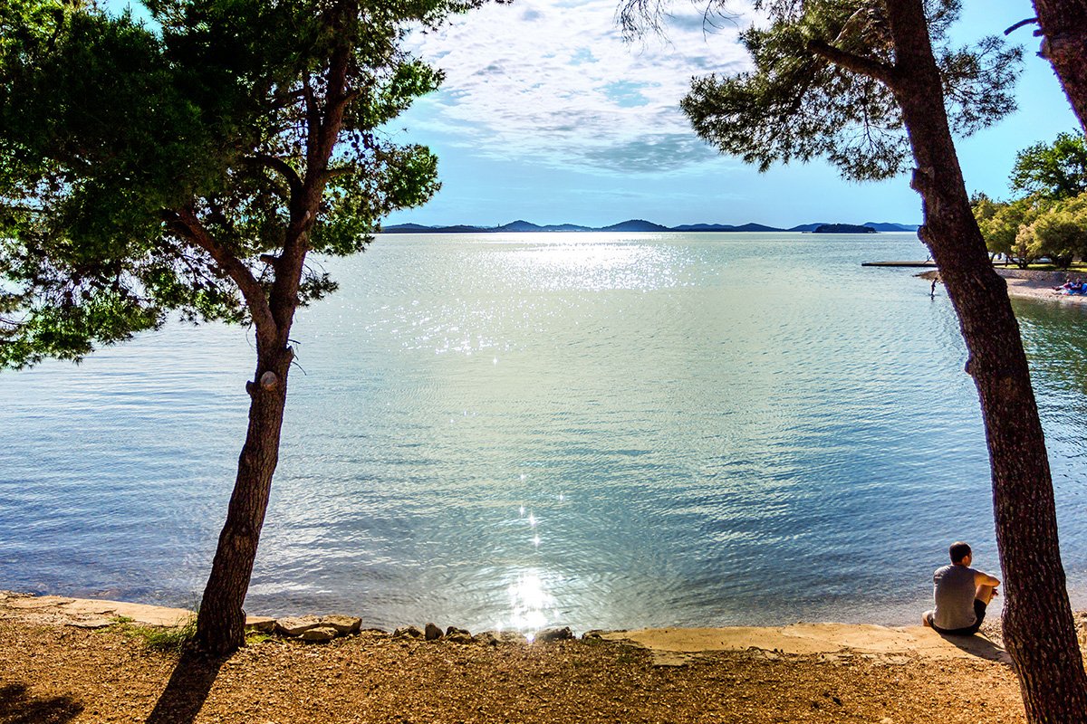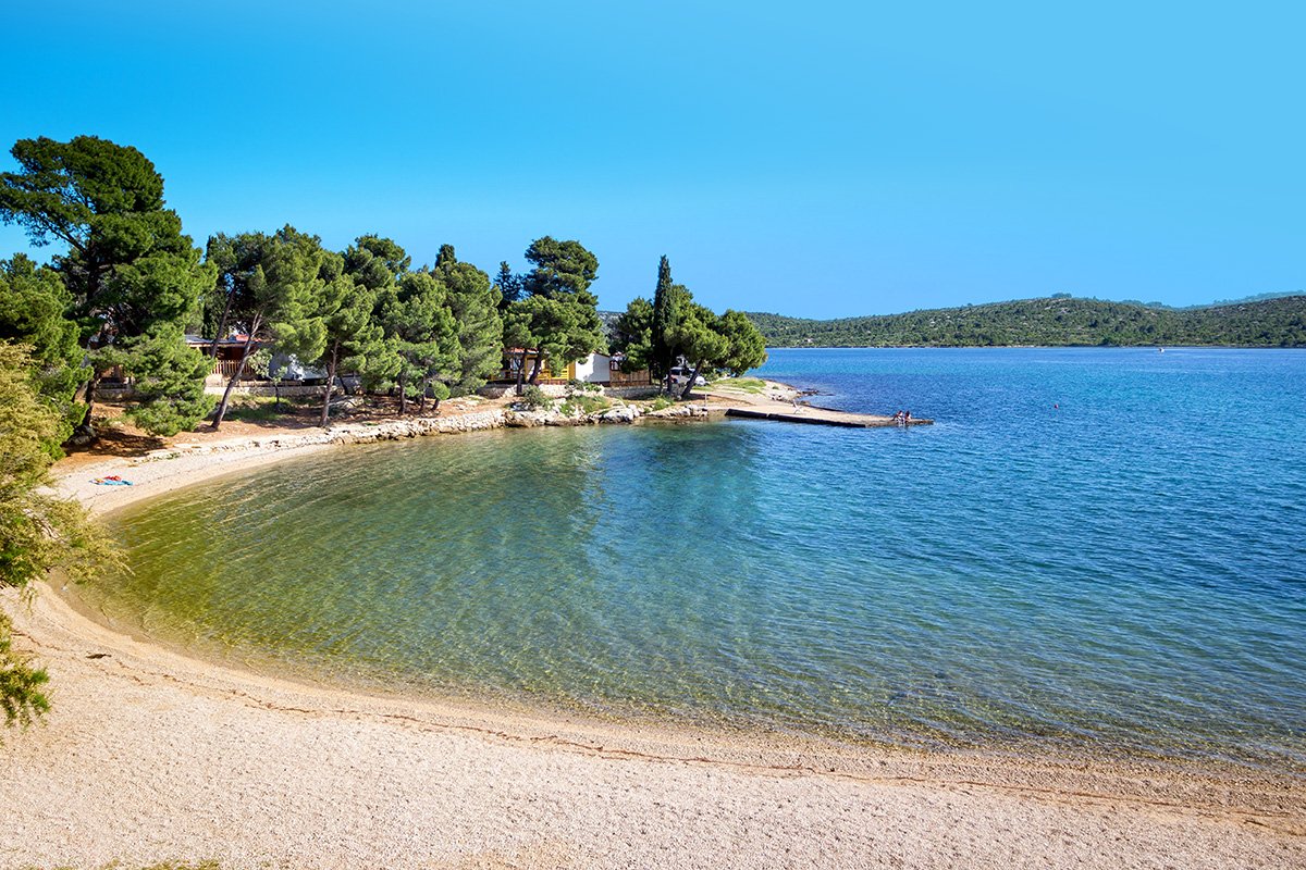 publiczna, w zatoczce Pirovac, z widokiem na wyspę Sustipanac, żwirkowa, przy hotelu, leżaki płatne (ok. 3 EUR/dzień).