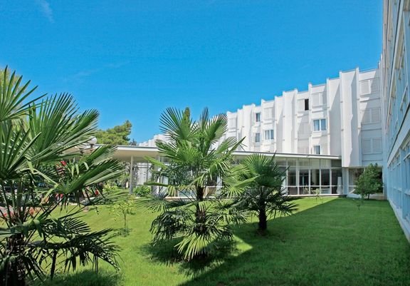 trzygwiazdkowy, zadbany i stylowy, zbudowany w latach 70., częściowo odnowiony na przełomie 2008/2009 r., 236 pokoi, 1 budynek, 2 piętra, 2 windy, lobby, całodobowa recepcja, restauracja główna Jakov – dania w formie bufetu lub serwowane, kuchnia europejska, dostępne foteliki i menu dla dzieci, dania wegetariańskie (na zamówienie przed wyjazdem), 2 bary: bar przy basenie i bar na tarasie; sklep z pamiątkami, kantor, bankomat; taras z widokiem na basen; za opłatą: sejf w recepcji, internet bezprzewodowy w lobby; akceptowane karty kredytowe: Visa, MasterCard, American Express, Diners Club; Gości hotelu mogą korzystać z infrastruktury kompleksu Solaris (część udogodnień za opłatą).