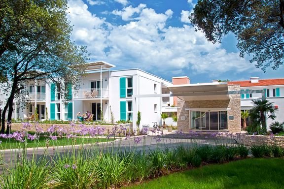 czterogwiazdkowy, regularnie odnawiany, 37 pokoi, kilka budynków, 2 piętra, przestronne lobby, całodobowa recepcja, 3 restauracje: główna Mediterraneo – dania w formie bufetu, kuchnia chorwacka i międzynarodowa, Istryjska Tawerna – à la carte, kuchnia chorwacka, Delfin – à la carte, ryby i owoce morza, 4 bary, w tym na plaży, w lobby, snack-bar i przy basenie; parking, punkt wymiany walut, minimarket, przechowalnia rowerów; za opłatą: lekarz na wezwanie, opiekunka do dziecka, pralnia, wypożyczalnia rowerów; akceptowane karty kredytowe: Visa, American Express, MasterCard.