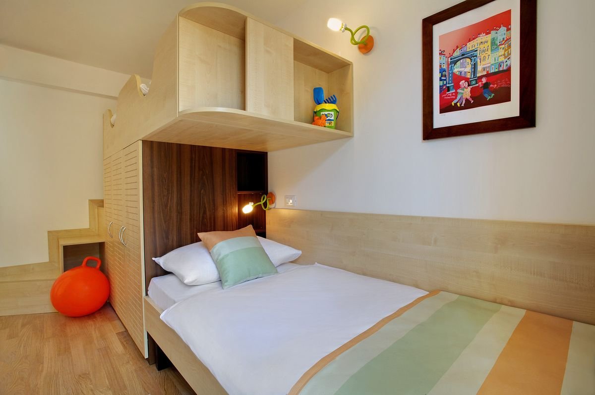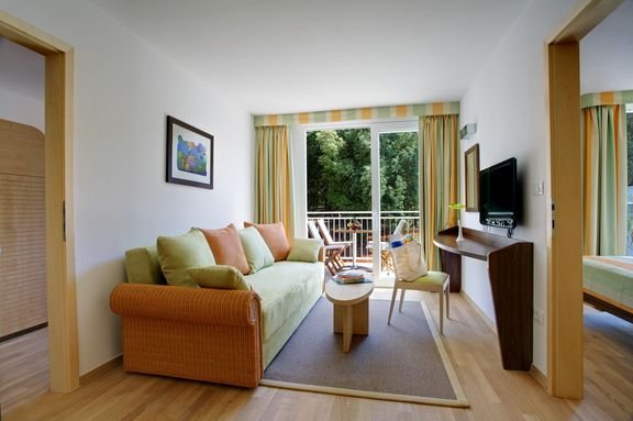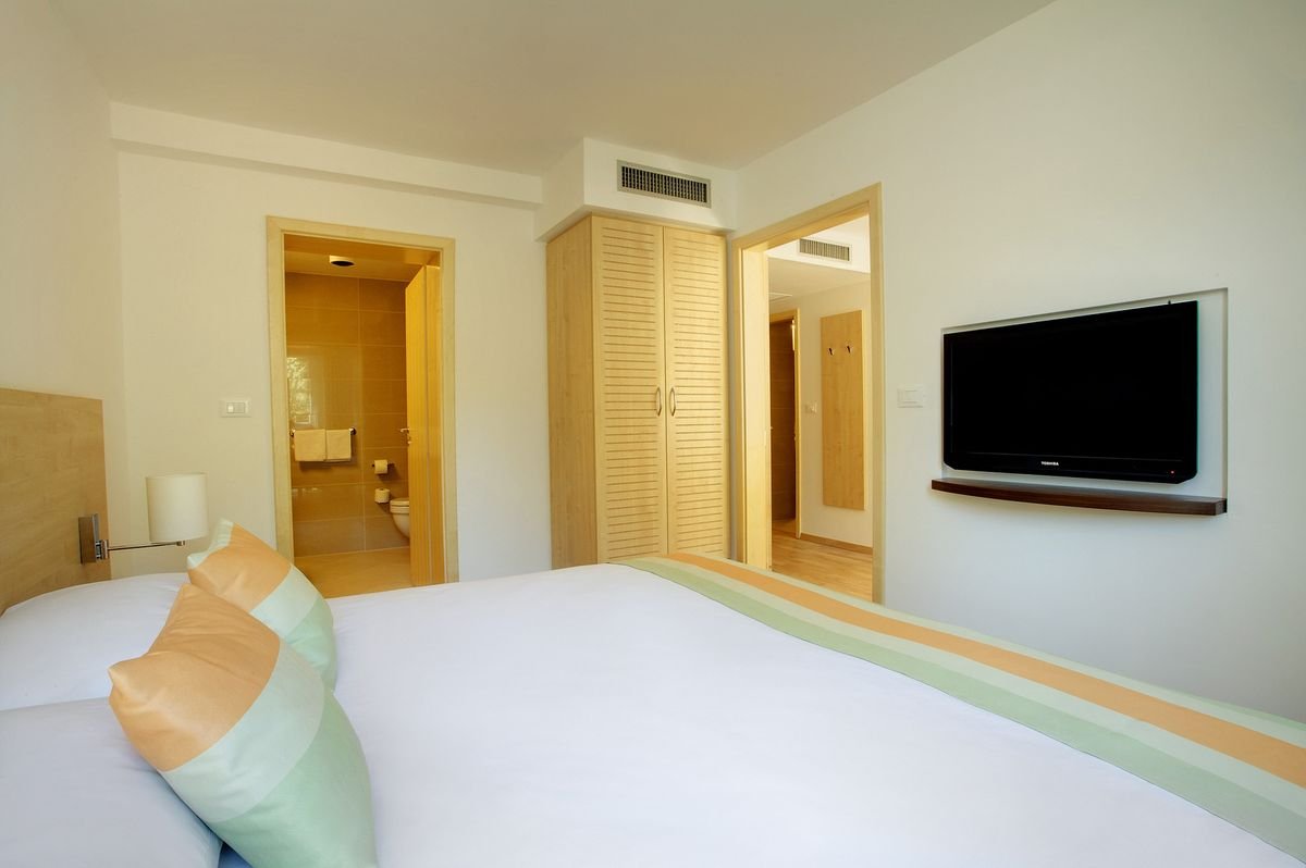 rodzinny: 4-os. (możliwość 1 dostawki), ok. 44 m2, klimatyzowany, łazienka (wanna i prysznic, wc; suszarka), pokój dzienny oddzielony drzwiami od sypialni, internet bezprzewodowy, telewizja satelitarna, telefon, sejf, minibar (płatny wg konsumpcji); łóżeczko dla dziecka do 2 lat na zamówienie przed przyjazdem (płatne); balkon lub taras (stolik i krzesełka), widok na okolicę.