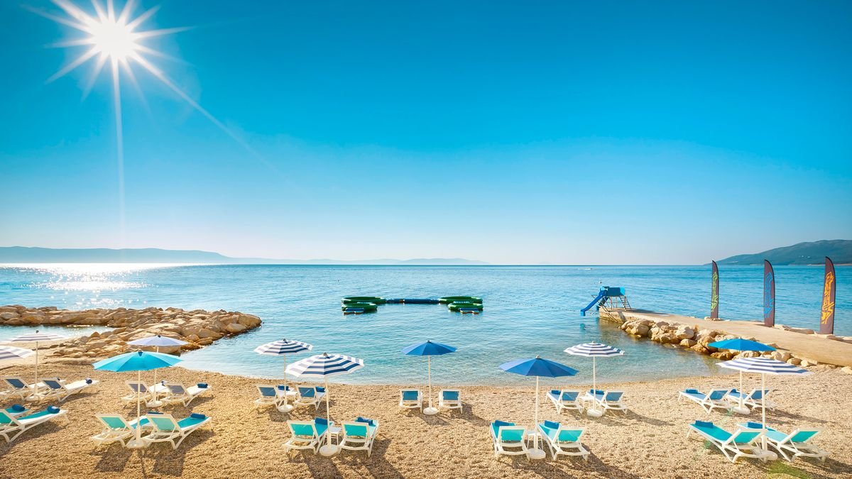 hotelowa, kamienista, zalecane obuwie ochronne, łagodne zejście do morza, wyróżniona certyfikatem Błękitna Flaga, przejście przez promenadę, zejście do plaży po schodach, parasole i leżaki płatne.