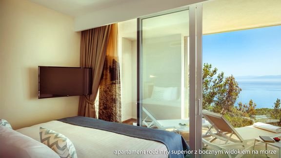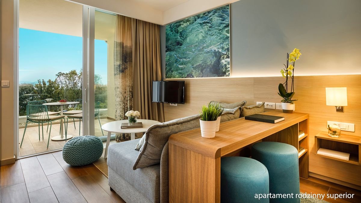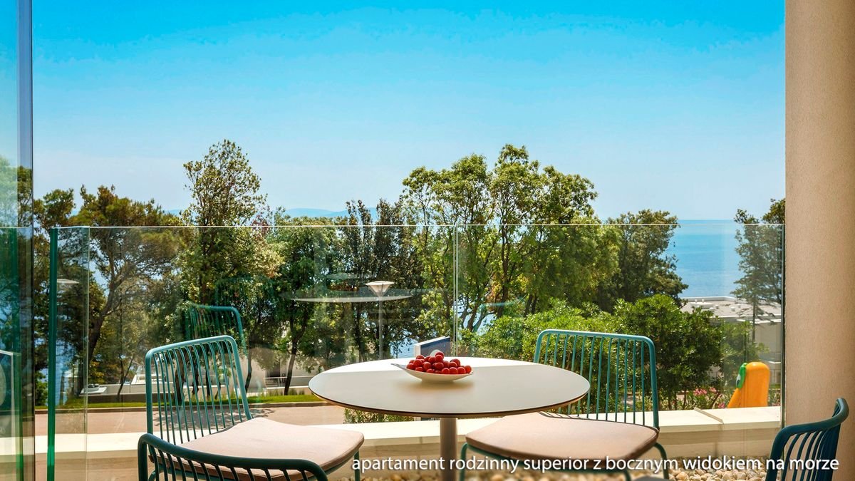 apartament rodzinny superior: 3-os. (możliwość 1 dostawki dla dziecka – łóżko piętrowe), ok. 39 m², klimatyzowany, łazienka (wanna lub prysznic), osobne wc, internet bezprzewodowy, telewizja satelitarna, zestaw do kawy/herbaty, minibar (płatny), akcesoria dla dzieci na życzenie: wanienka, nocnik, zestaw toaletowy; bezpłatne łóżeczko dla dziecka do 2 lat na zamówienie przed przyjazdem; balkon, widok na ogród; boczny widok na morze za dopłatą.