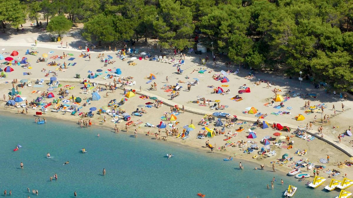hotelowa, piaszczysta, miejscami żwirowa, wyróżniona certyfikatem Błękitna Flaga, ok. 1,5 km długości, bezpośrednio przy hotelu, łagodne zejście do morza, parasole i leżaki płatne; bar.