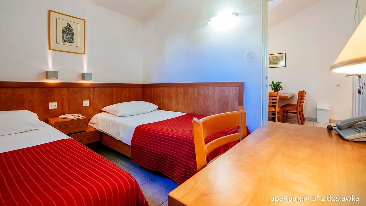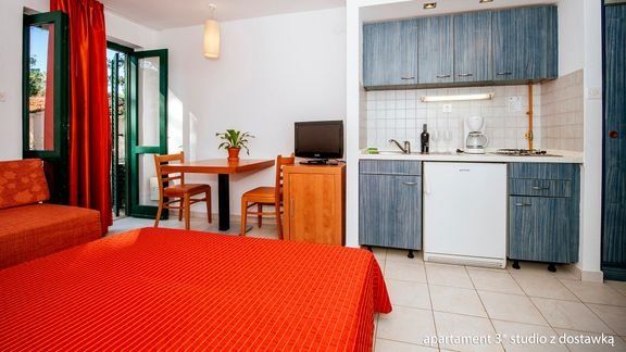 3* studio: 2-os. (możliwość 1 dostawki), na parterze, ok. 20 m², klimatyzowany, łazienka (prysznic, wc; suszarka, ręczniki), internet bezprzewodowy, telewizja satelitarna, jadalnia z aneksem kuchennym, lodówka, czajnik elektryczny, suszarka na pranie, akcesoria kuchenne, akcesoria do sprzątania, sejf; łóżeczko dla dziecka do 2 lat na zamówienie przed przyjazdem (płatne: 6 EUR/noc); taras, meble na tarasie; 4* studio comfort: 2-os., na parterze, ok. 25 m², klimatyzowany, łazienka (prysznic, wc; suszarka, ręczniki), internet bezprzewodowy, telewizja satelitarna, jadalnia z aneksem kuchennym, lodówka, czajnik elektryczny, suszarka na pranie, akcesoria kuchenne, akcesoria do sprzątania, sejf; łóżeczko dla dziecka do 2 lat na zamówienie przed przyjazdem (płatne: 6 EUR/noc); taras, meble na tarasie; 4* studio superior: 2-os., na parterze, ok. 29 m², klimatyzowany, łazienka (prysznic, wc; suszarka, ręczniki), internet bezprzewodowy, telewizja satelitarna, jadalnia z aneksem kuchennym, lodówka, czajnik elektryczny, suszarka na pranie, akcesoria kuchenne, akcesoria do sprzątania, sejf; łóżeczko dla dziecka do 2 lat na zamówienie przed przyjazdem (płatne: 6 EUR/noc); taras, meble na tarasie; 3* apartament: 4-os. (możliwość 1 dostawki), na parterze lub piętrze, ok. 29 m², pokój dzienny i sypialnia, łazienka (prysznic, wc; suszarka, ręczniki), wyposażenie jak w 3* studio; przy 1 dostawce: ok. 35 m², pokój dzienny i 2 sypialnie; 4* apartament comfort: 4-os. (możliwość 1 lub 2 dostawek), na parterze lub piętrze, ok. 29 m², sypialnia i pokój dzienny, łazienka (prysznic, wc; suszarka, ręczniki), wyposażenie jak w 3* studio, dodatkowo: ekspres do kawy i kuchenka mikrofalowa; przy 2 dostawkach: ok. 35 m², pokój dzienny i 2 sypialnie; 4* apartament superior: 4-os. lub 6-os., na parterze lub piętrze, ok. 43 m², sypialnia i pokój dzienny, łazienka (prysznic, wc; suszarka, ręczniki) lub ok. 64 m², pokój dzienny i 2 sypialnie, 2 łazienki (prysznic, wc, suszarka, ręczniki), 2 telewizory LCD, wyposażenie jak w 3* studio; dodatkowo: ekspres do kawy i kuchenka mikrofalowa; pokoje: 4* studio comfort, 4* studio superior, 3* apartament, 4* apartament comfort, 4* apartament superior za dopłatą.