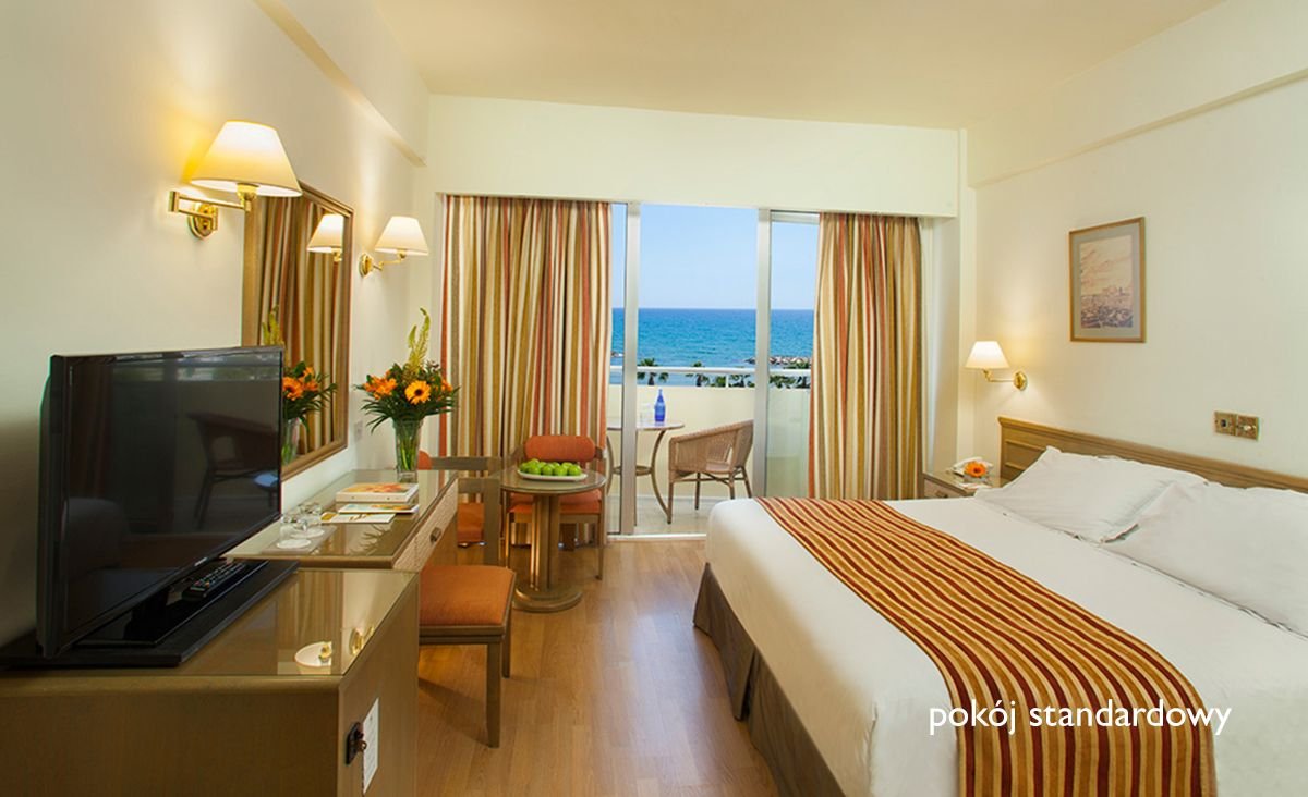 Elegancki i zadbany, położony w pierwszej linii brzegowej, z zachwycającym widokiem na turkusowe morze. Tuż obok piaszczysta plaża, świetna na rodzinny wypoczynek, idealna również dla amatorów wodnych aktywności. Dumą hotelu jest piękny basen z kaskadą i hydromasażem, ulubione miejsce na relaks i ochłodę, dzieciaki ucieszą się z basenu z wodnym placem zabaw. Wygodne, urządzone w pastelowych kolorach pokoje, restauracje nie tylko z dobrą kuchnią, ale również z widokiem na basen lub morze, umilą pobyt każdemu z Gości. Blisko hotelu przystanek autobusowy, z którego łatwo jest się dostać do centrum Larnaki z piękną promenadą palmową i bizantyjskim kościołem św. Łazarza.