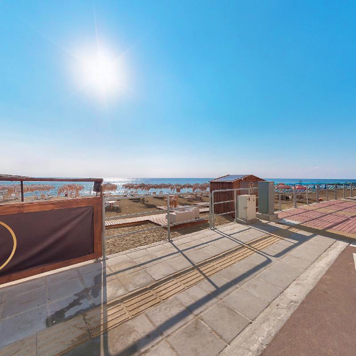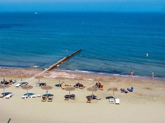 publiczna, piaszczysta, łagodne zejście do morza, wyróżniona certyfikatem Błękitna Flaga, ok. 100 m od hotelu, przejście przez ulicę, parasole i leżaki płatne (ok. 2,5 EUR/szt.).