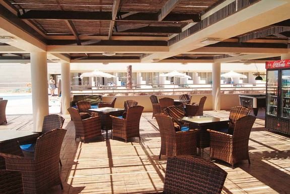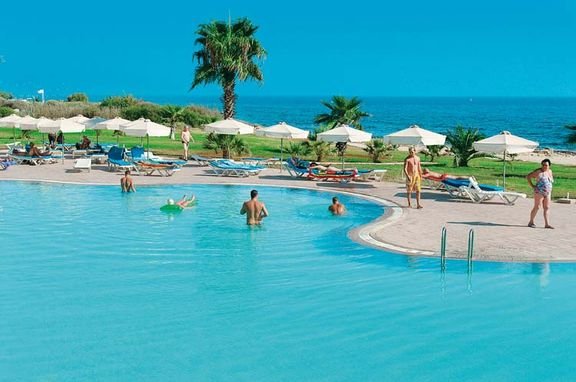 duży basen, nieregularny kształt, słodka woda, gł. 0,2-1,5 m, bezpłatne parasole i leżaki przy basenie i na trawiastym tarasie słonecznym, basen kryty; kort tenisowy (ok. 5 EUR/sprzęt; 20 EUR/depozyt), bilard, siatkówka plażowa; za opłatą: sauna (ok. 10 EUR/godz.); bogata oferta sportów wodnych przy Nissi Beach (rowery wodne, narty wodne, paragliding).