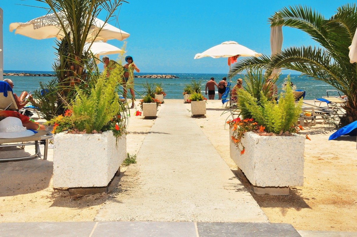 Oroklini Beach, publiczna, piaszczysto-kamienista, łagodne zejście do morza, bezpośrednio przy hotelu, na wydzielonym odcinku tuż przy plaży: bezpłatne parasole, leżaki i materace.