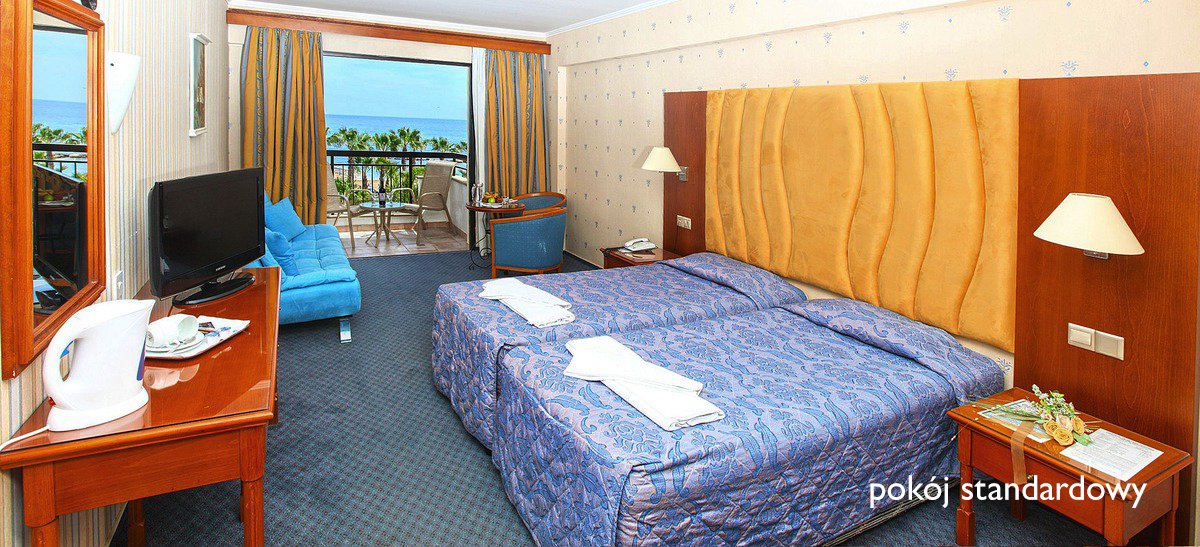 standardowy: 2-os. (możliwość 1 dostawki), ok. 23 m2, zadbany, elegancki, klimatyzowany, łazienka (wanna, wc; suszarka), telewizja satelitarna, telefon, lodówka, zestaw do kawy i herbaty; za opłatą: internet bezprzewodowy (10 EUR/dzień., 24 EUR/tydz.), sejf (2,5 EUR/dzień, 15 EUR/tydz., 28 EUR/2 tyg.); bezpłatne łóżeczko dla dziecka do 2 lat na zamówienie przed przyjazdem; balkon (stolik i krzesełka; suszarka); boczny lub frontalny widok na morze za dopłatą; z 2 dostawkami: 2-os. (możliwość 2 dostawek), ok. 24 m2, wyposażenie jak w pokoju standardowym; pokój z 2 dostawkami za dopłatą.