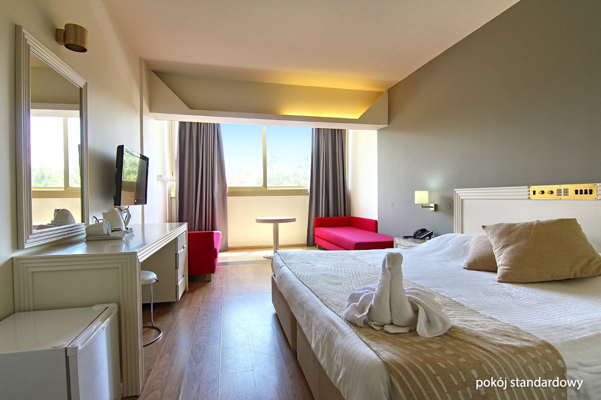 standardowy: 2-os. (możliwość 1 dostawki), w budynku głównym, ok. 25 m², klimatyzowany (w sezonie letnim) lub ogrzewany (w sezonie zimowym), łazienka (wanna, wc; suszarka), telewizja satelitarna, telefon, zestaw do kawy/herbaty; za opłatą: internet bezprzewodowy (ok. 15 EUR/12 godz., 30 EUR/7 dni), lodówka (2 EUR/dzień), sejf (ok. 3 EUR/dzień); bezpłatne łóżeczko dla dziecka do 2 lat na zamówienie przed przyjazdem; niektóre pokoje z balkonem (stolik i krzesełka); widok na morze za dopłatą; rodzinny: 2-os. (możliwość 1 lub 2 dostawek), w budynku głównym, ok. 34 m², wyposażenie jak w pokoju standardowym; pokój rodzinny na zamowienie, za dopłatą.