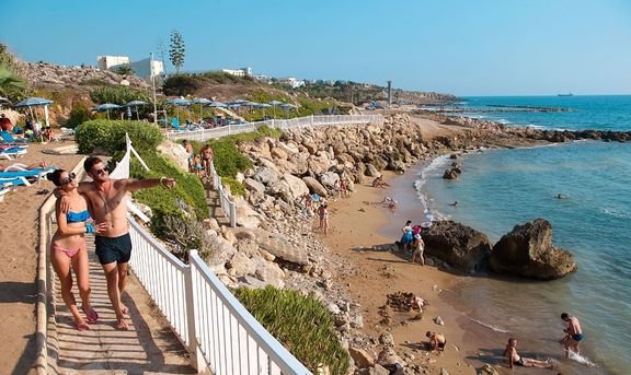publiczna, mała, piaszczysto-skalista, klifowe zejście do morza, ok. 120 m od hotelu, dojście ścieżką, drewnianym pomostem i schodami, na wydzielonym odcinku plaży bezpłatne parasole i leżaki, ręczniki za kaucją (ok. 10 EUR).