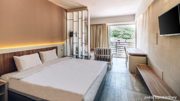 classic: 2-os., ok. 22 m², klimatyzowany, łazienka (prysznic, wc; suszarka), internet bezprzewodowy, telewizja satelitarna, telefon; za opłatą: sejf, minibar; bezpłatne łóżeczko dla dziecka do 2 lat na zamówienie przed przyjazdem; taras; widok na góry za dopłatą; standardowy: 2-os. (możliwość 1 dostawki), ok. 25 m², wyposażenie jak w pokoju classic; taras; boczny widok na morze i widok na morze za dopłatą; superior: 2-os. (możliwość 1 dostawki), ok. 25 m², wyposażenie jak w pokoju classic; taras, boczny widok na morze; rodzinny: 2-os. (możliwość 1 lub 2 dostawek dla dzieci), ok. 28 m², wyposażenie jak w pokoju classic; taras; rodzinny superior: 2-os. (możliwość 1 lub 2 dostawek), ok. 28 m², wyposażenie jak w pokoju classic; taras; widok na morze za dopłatą; pokoje: standardowy, superior, rodzinny i rodzinny superior za dopłatą.